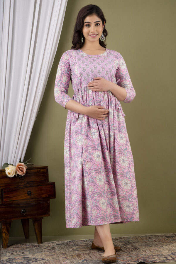 This dress is thoughtfully designed to support you through every stage of pregnancy and postpartum. It features a flattering empire waist with adjustable side ties (dori) to ensure a comfortable fit as your bump grows. For post-pregnancy convenience, it is equipped with discreetly concealed vertical nursing zippers, making feeding effortless and private. The lightweight fabric and elegant gathered flare make it an ideal choice for baby showers, festive occasions, or daily comfort.