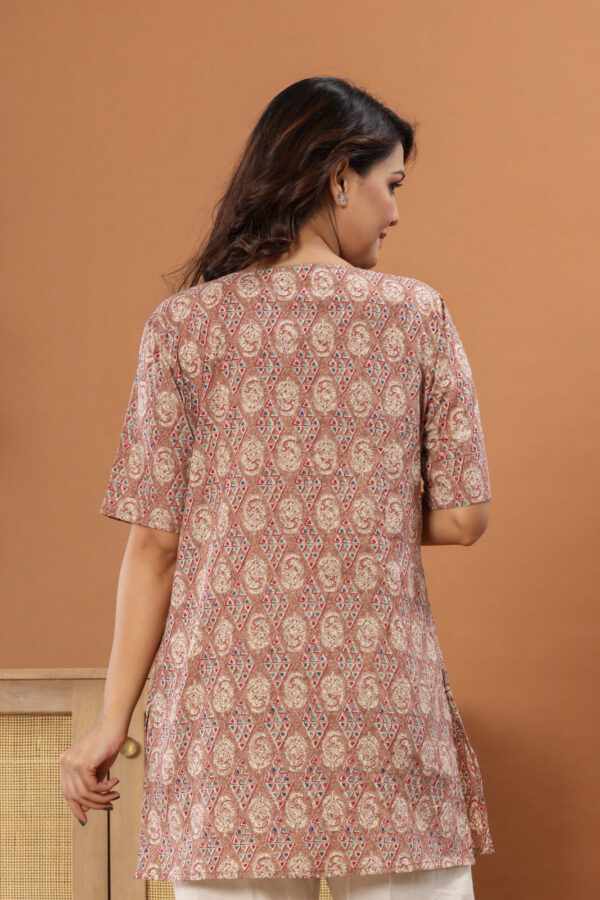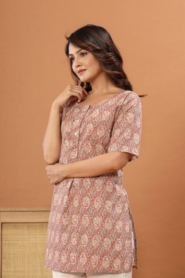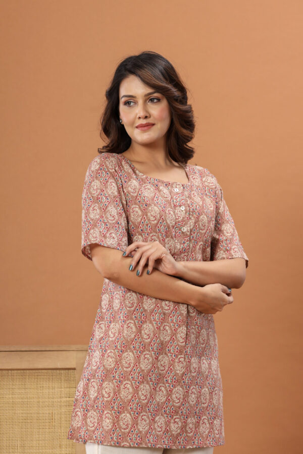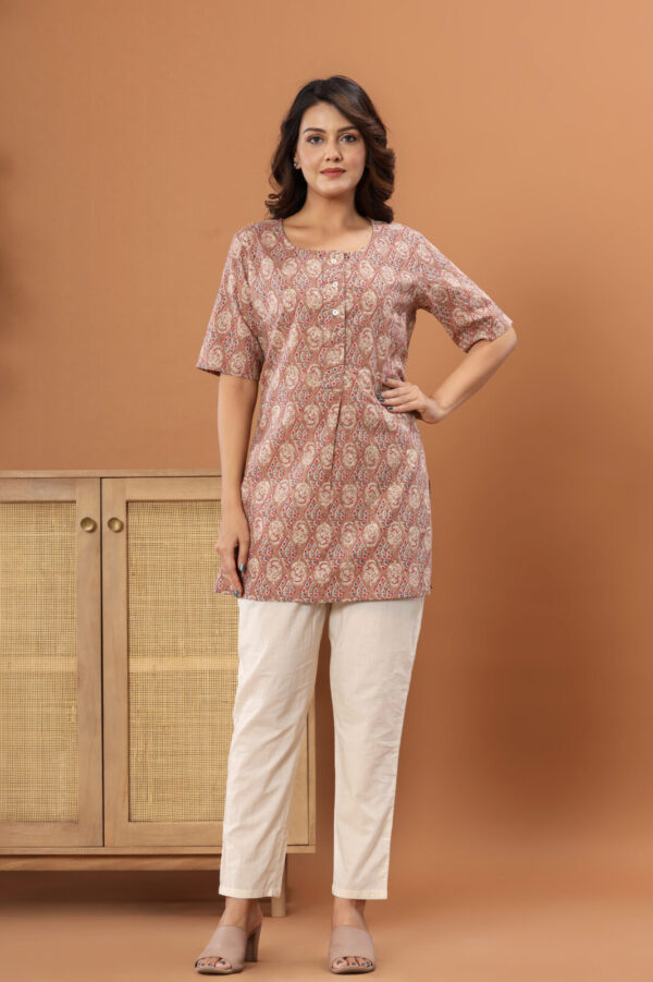 The tunic is designed with a straight-cut silhouette that provides a relaxed yet structured fit. It features a modern square-round neckline and a classic functional button-down front placket. With its comfortable short sleeves and versatile length, it’s a perfect choice for office wear, casual outings, or a day of errands. Pair it with white trousers or light-colored palazzos for a clean, effortless ensemble.