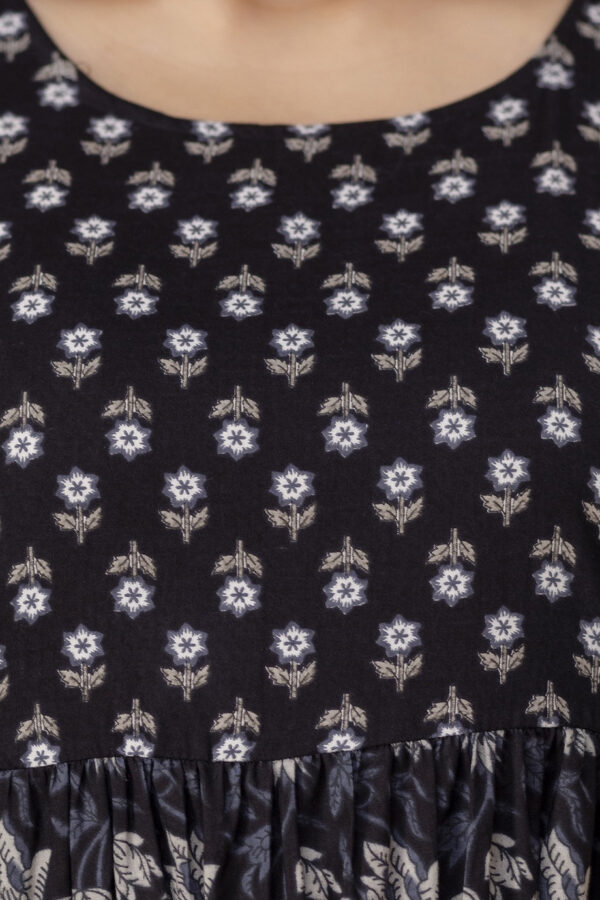Exude timeless elegance throughout your motherhood journey with our Black Floral Anarkali. Meticulously crafted from 100% premium soft cotton, this dress features a sophisticated dual-print design: a lush, grey-toned floral and leaf pattern on the flare, perfectly complemented by a delicate floral butti print on the yoke.