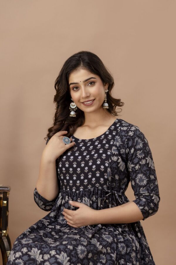 Thoughtfully engineered for both comfort and utility, this dress features a flattering empire waist with adjustable side ties (dori) to provide a customized fit as your silhouette evolves. For post-pregnancy convenience, it is equipped with discreetly concealed vertical nursing zippers, allowing for easy and private feeding. Whether you are attending a festive gathering or looking for elevated daily wear, this breathable cotton dress ensures you stay poised and comfortable all day long.