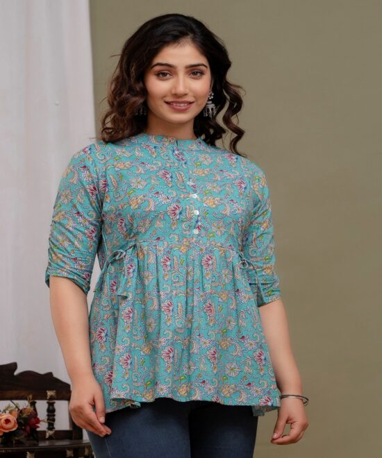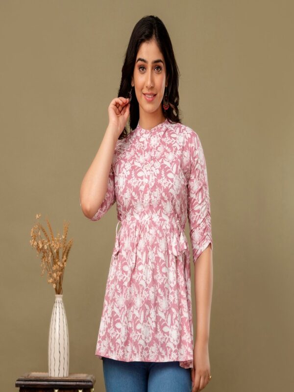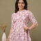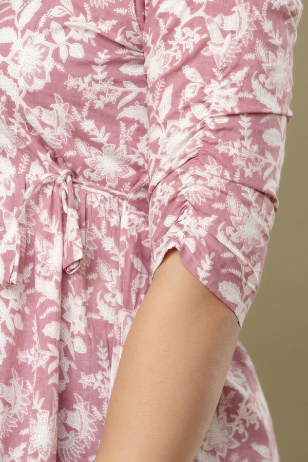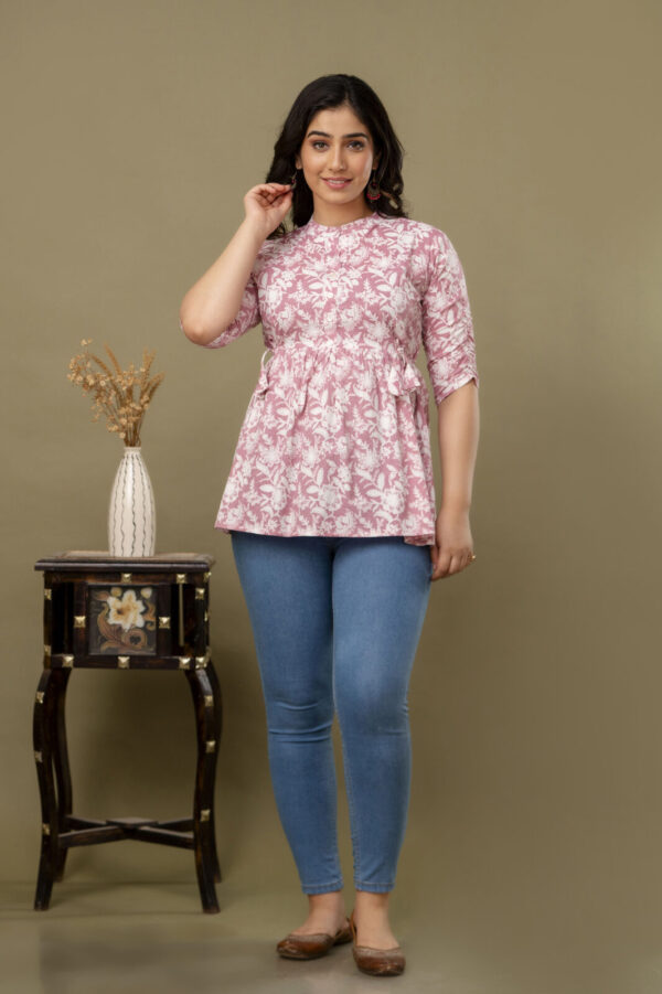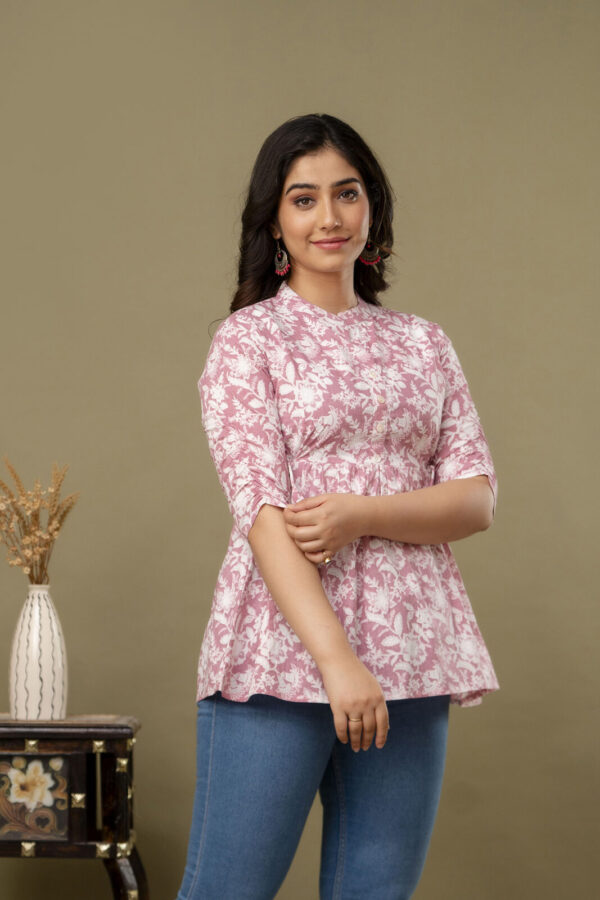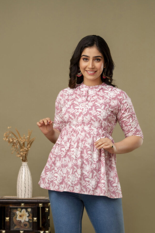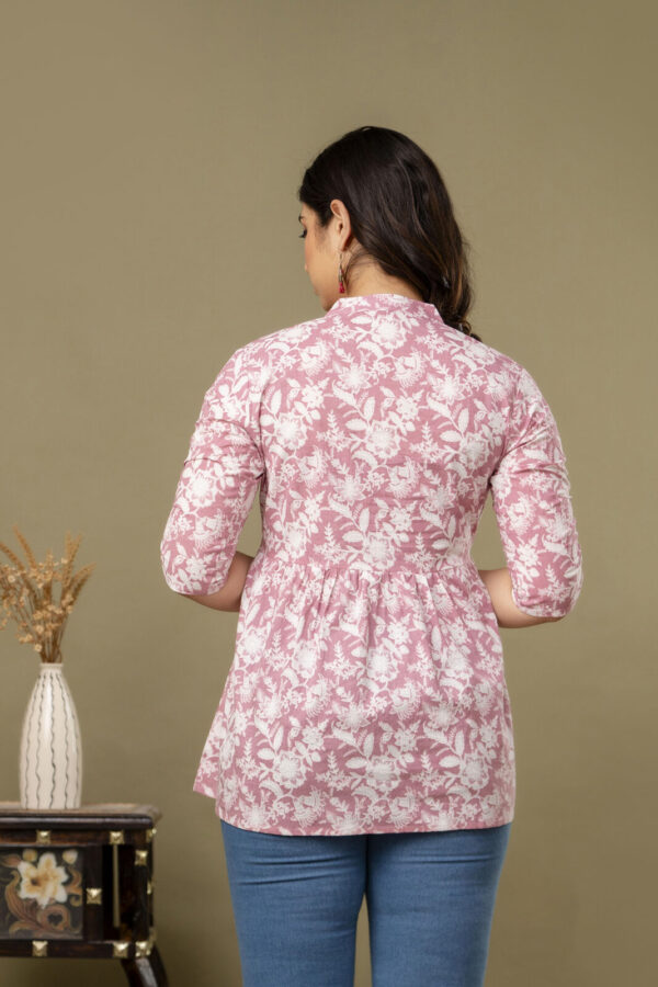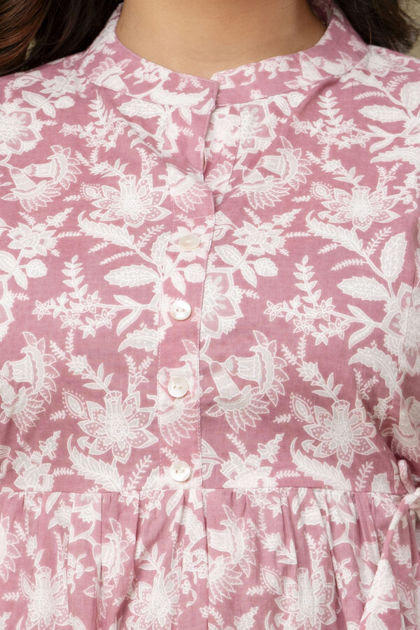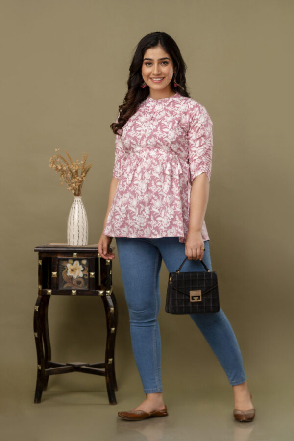 Embrace a look of soft elegance with our Blush Pink Floral Tunic, a perfect daily-wear staple for every stage of motherhood. Crafted from 100% premium soft cotton, this top features a beautiful white botanical block-print pattern on a dusty pink base. The lightweight, airy fabric is designed to keep you cool and comfortable from morning to evening.