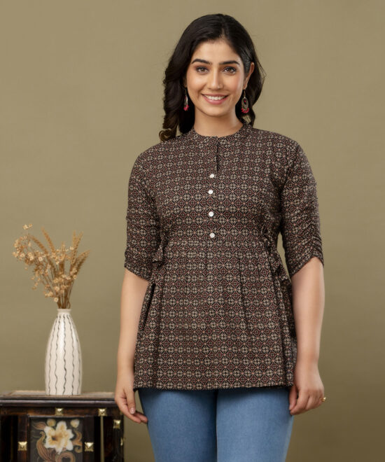 This tunic combines style with high utility, featuring an empire-line silhouette with adjustable side ties (dori) that allow the garment to grow with your bump. For post-pregnancy ease, it is equipped with discreetly concealed nursing zippers, making it simple to feed your baby on the go. With a refined mandarin collar, half-button placket, and three-quarter sleeves, this versatile top pairs effortlessly with jeans or leggings for a chic, coordinated look.