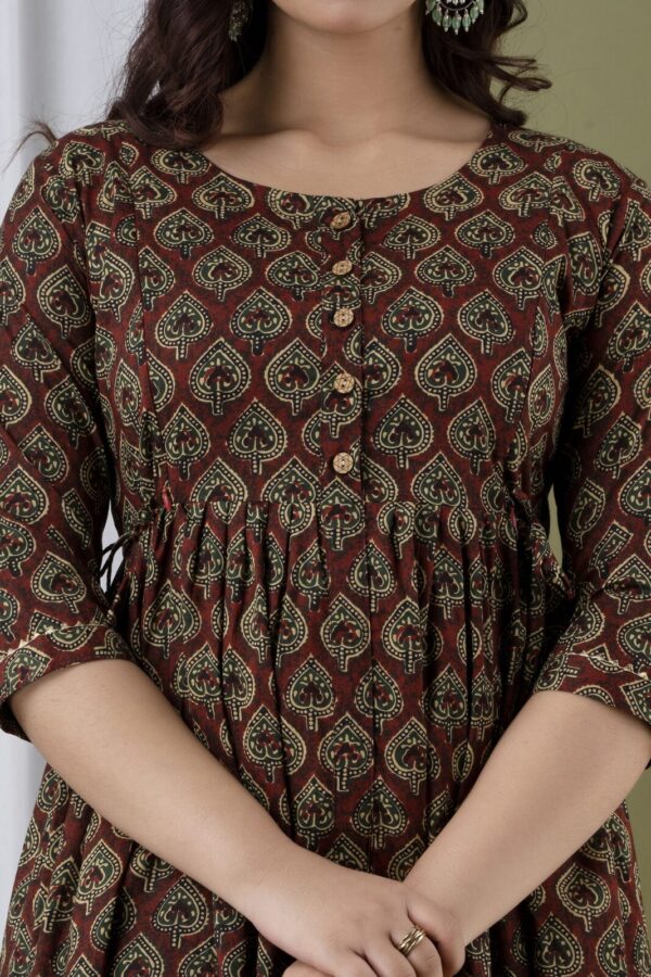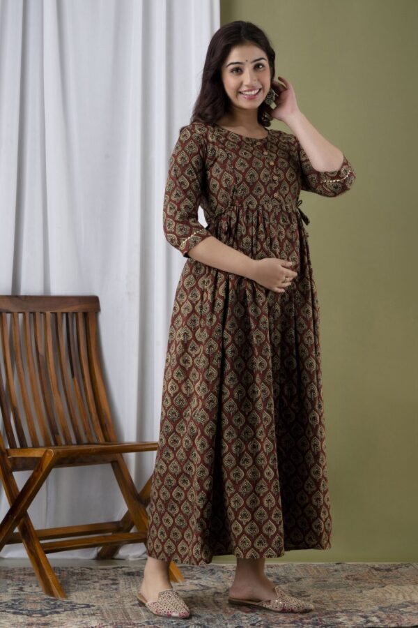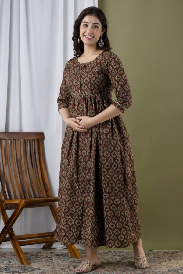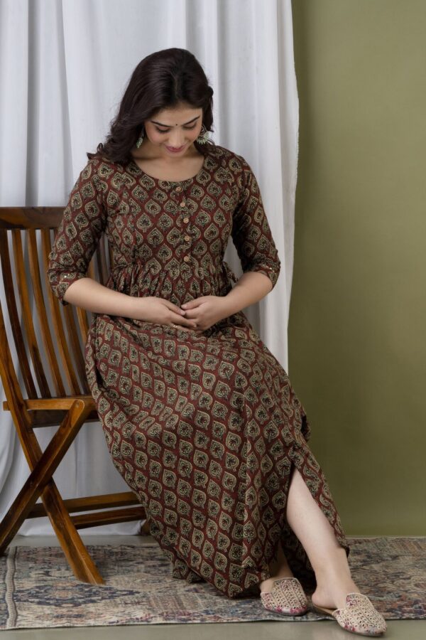 Exude earthy elegance with our Chocolate Brown Anarkali, a perfect blend of traditional block-print aesthetics and modern maternity functionality. Crafted from 100% premium breathable cotton, this dress features an intricate all-over leaf motif in muted gold and green tones, offering a sophisticated and grounded look for the modern mother.