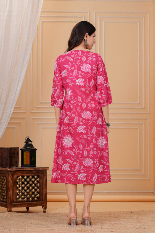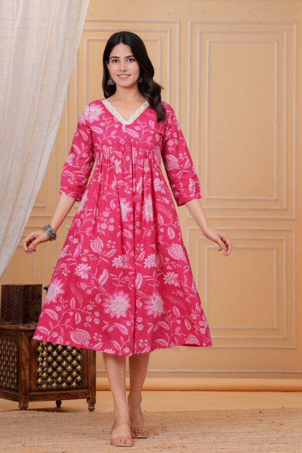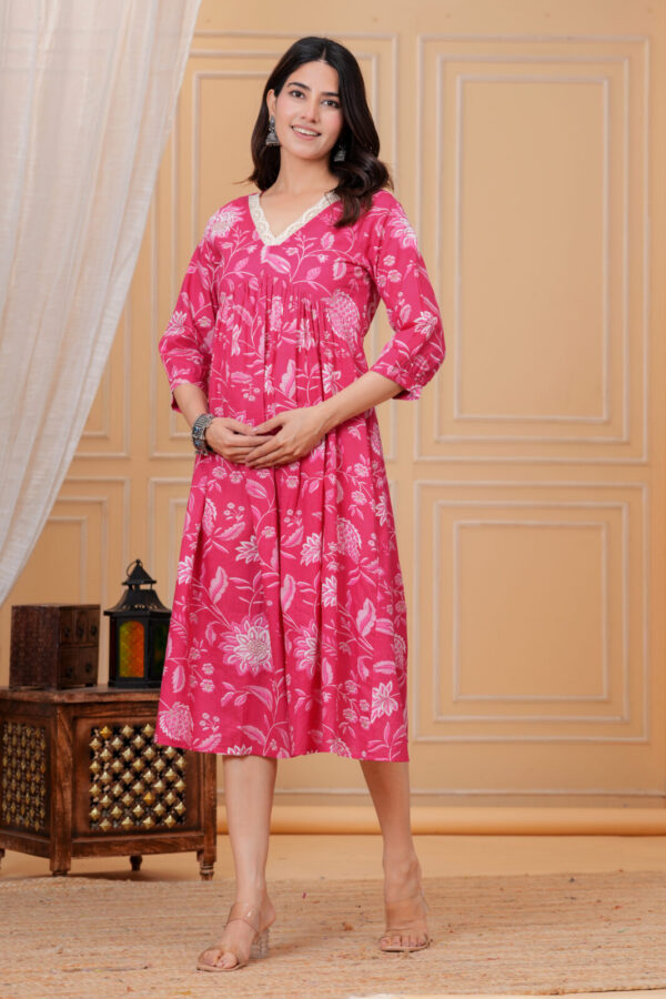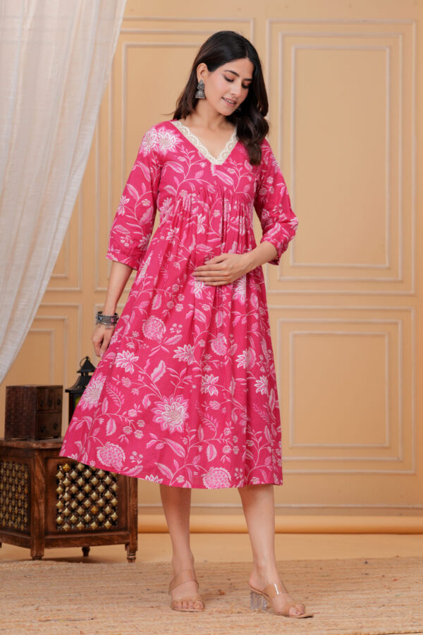 Front nursing access via a discreet flap or zip keeps feeding simple and private, paired with a pretty V‑neckline accented by lace for added elegance. The bold fuchsia pink with floral motifs brings energy to home wear, hospital trips, casual outings, or baby showers. 3/4 sleeves and midi length make it easy to style for any occasion.