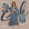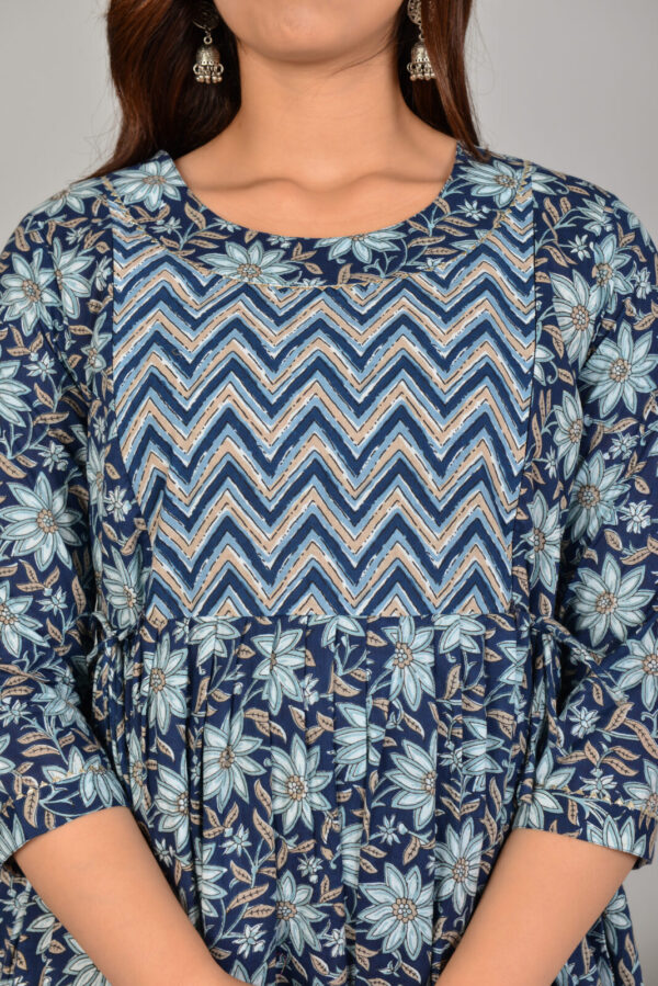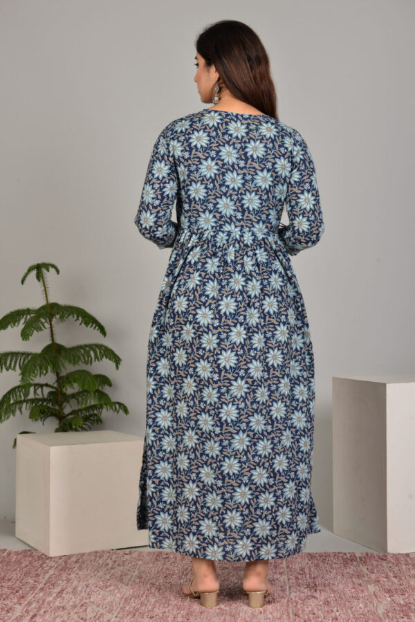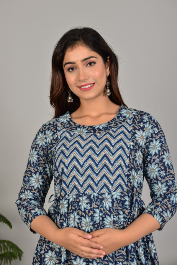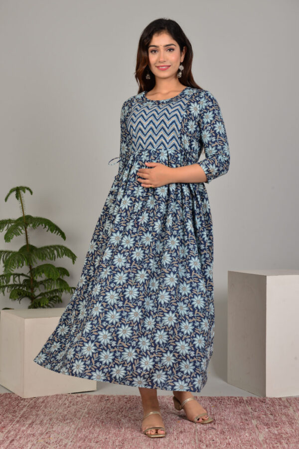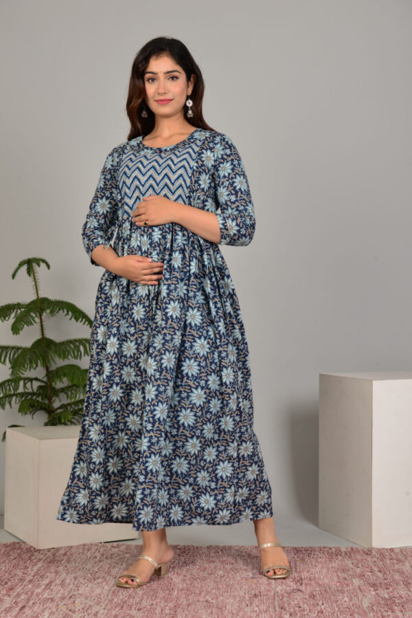 Discreet front nursing access ensures convenience without sacrificing style, complemented by a chevron patterned yoke that adds texture to the rich indigo base. Floral prints in lighter tones bring depth and vibrancy, making it suitable for home, casual outings, or small celebrations. The 3/4 sleeves and maxi length provide elegant, modest coverage.