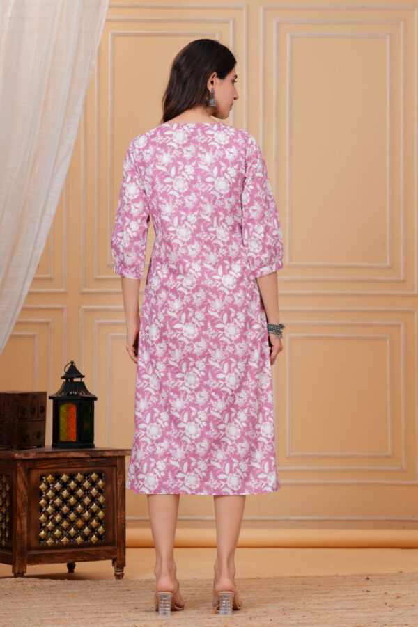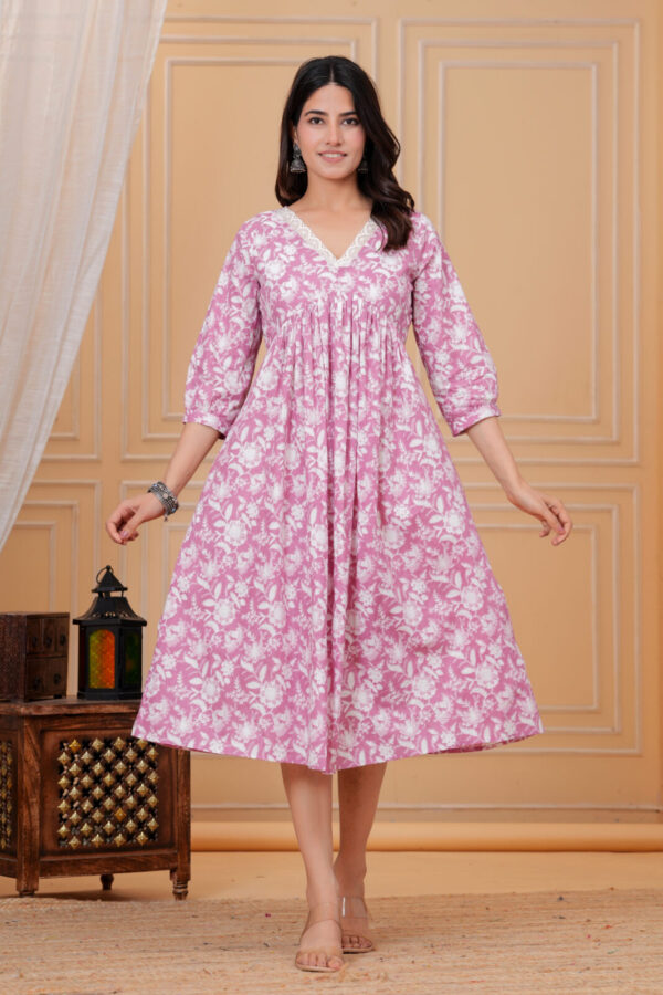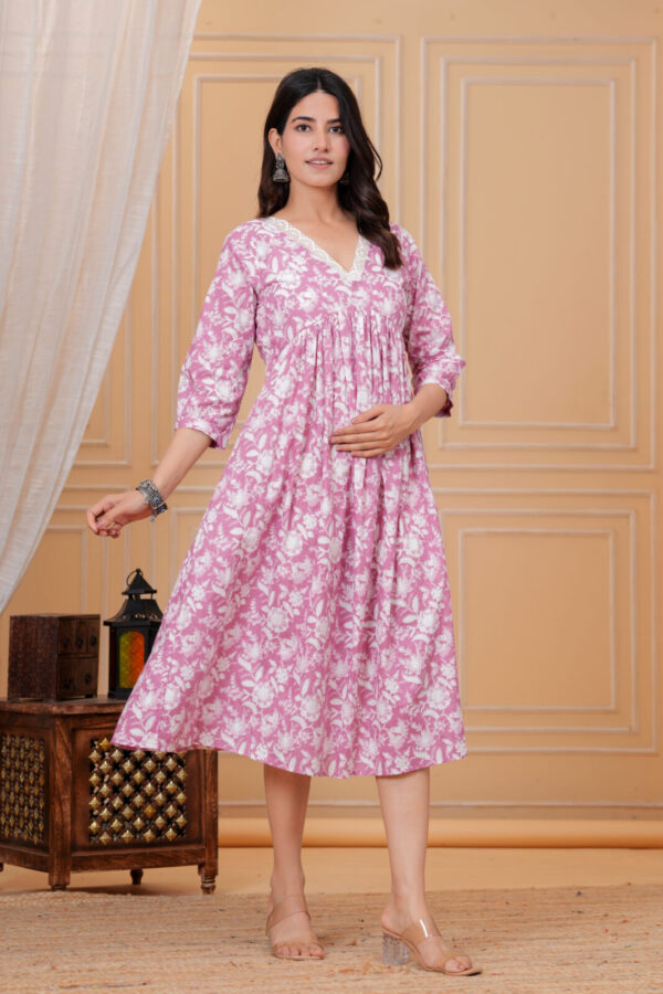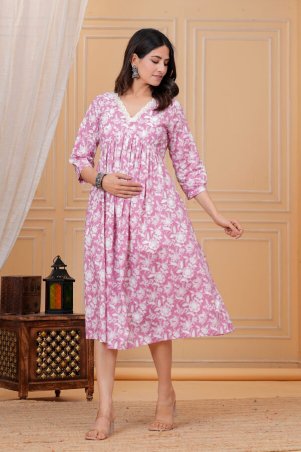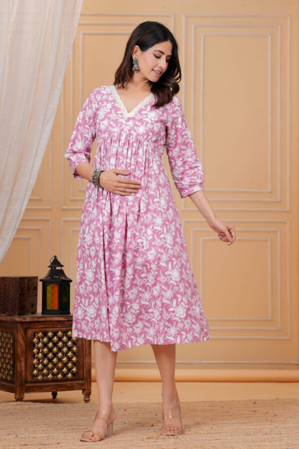 Lilac Floral Cotton Maternity & Nursing Midi Dress with V-Neck – 707