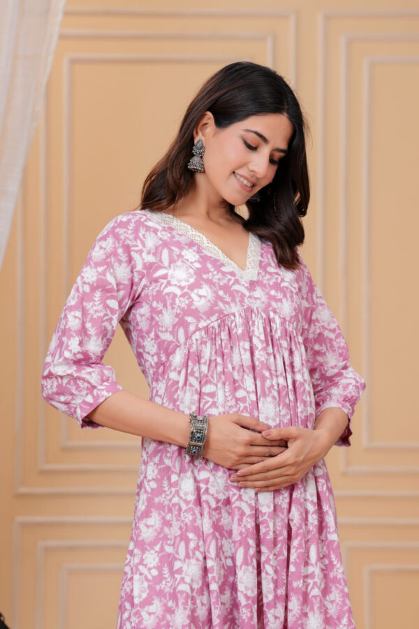 Discreet front nursing access via flap or zip makes feeding quick and private, complemented by a graceful V‑neck with lace detailing. The pale lilac tone with floral prints creates a calm, pretty look for home, hospital, or casual visits. 3/4 sleeves and midi length provide modesty and ease year‑round.
