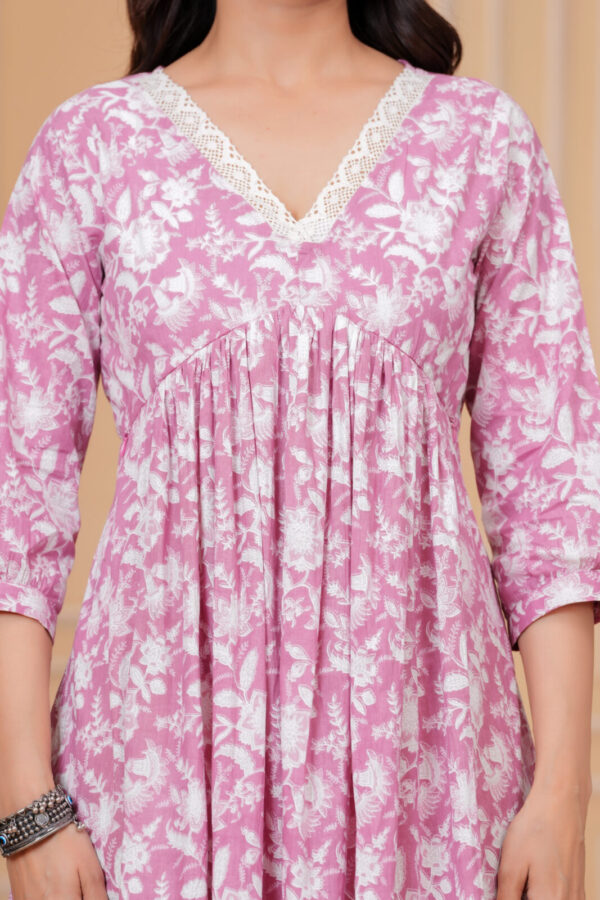 Enjoy subtle elegance in this lilac floral cotton maternity and nursing midi dress. Breathable cotton fabric drapes softly over your bump, ensuring comfort for pregnancy routines, nursing, and light outings. The empire waist with delicate gathers flatters your shape while offering plenty of room to grow.