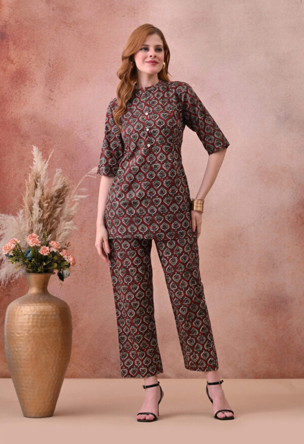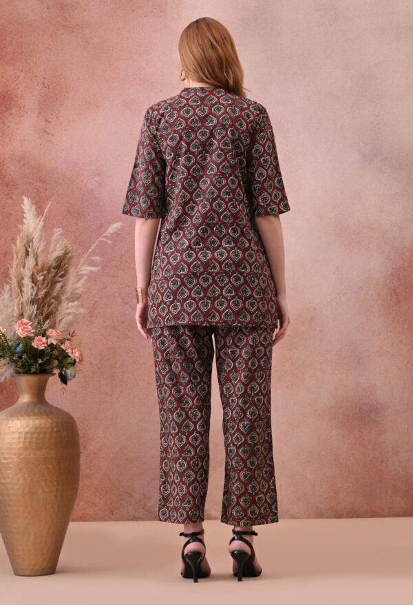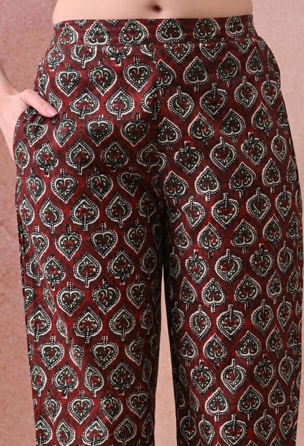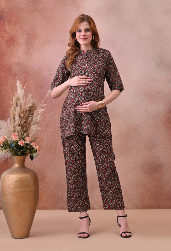 The rich maroon base with traditional Ajrakh block print in dark green, cream, and white gives this set a beautiful ethnic aesthetic, making it suitable for daily home wear, hospital stays, post-partum outings, and relaxed festive occasions. The matching bottom in the same coordinated print ensures a polished, put-together look throughout your motherhood journey.