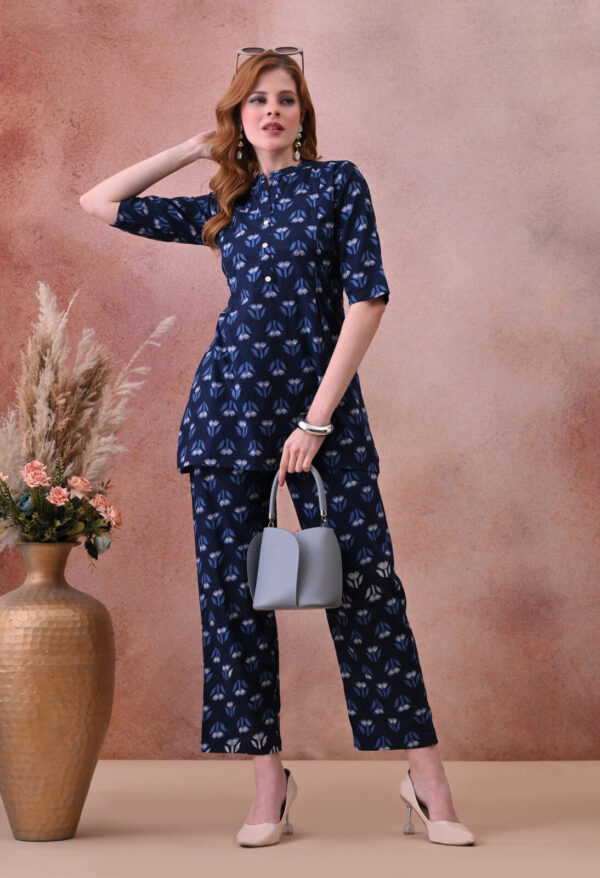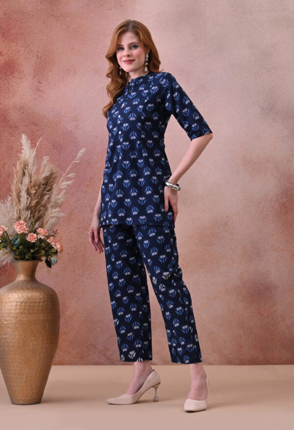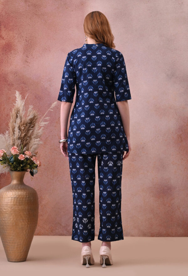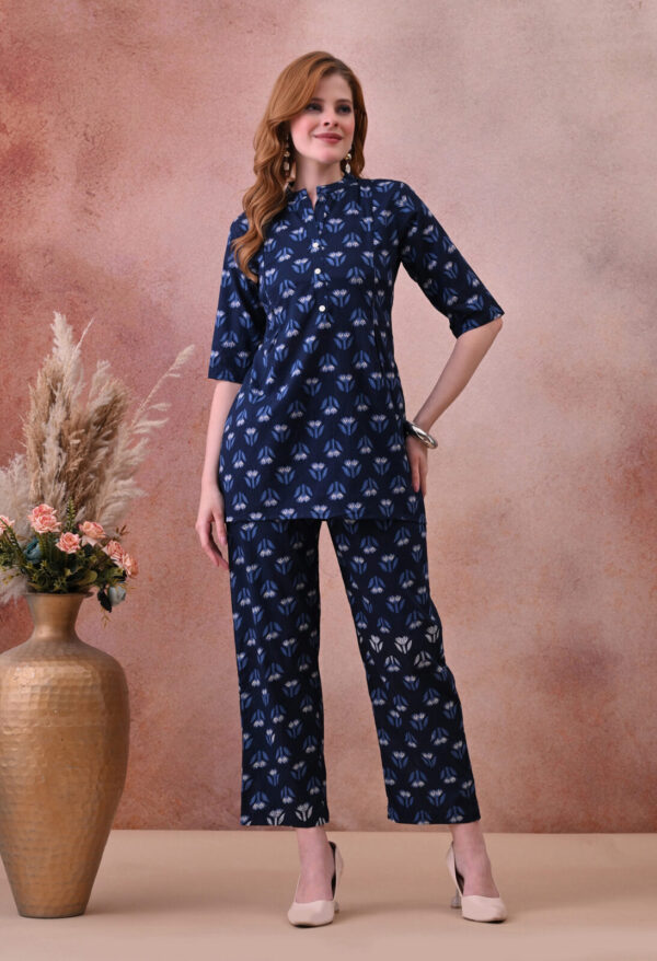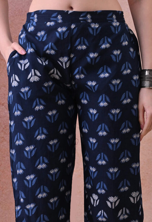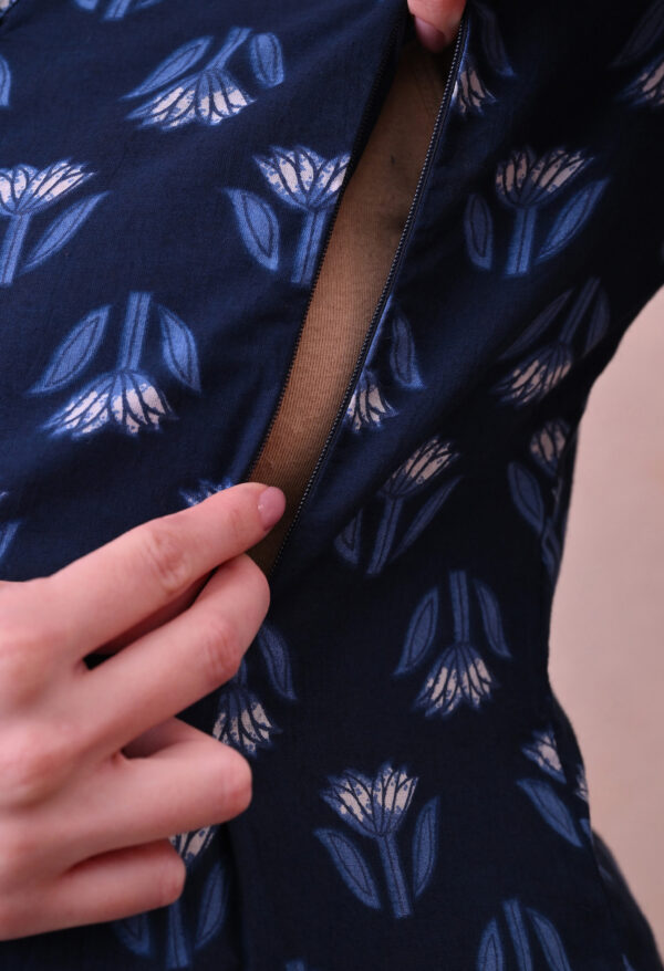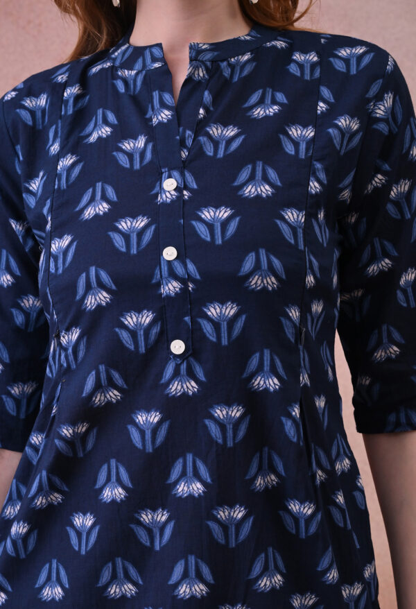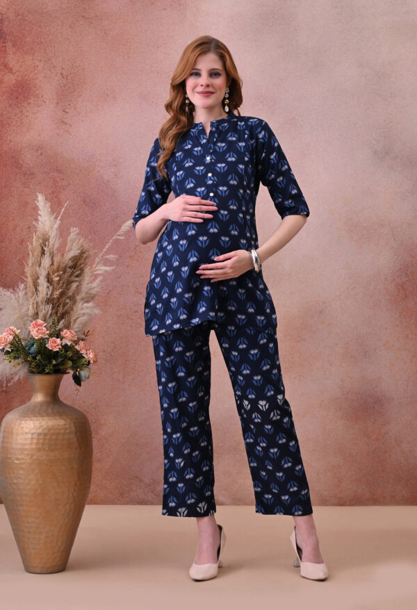 The deep navy base with delicate blue and white tulip motif block print gives this kurta a refined, understated look that works beautifully for daily wear, hospital visits, family outings, and post-partum occasions. The mandarin collar with a V-notch opening and 3/4 sleeves add a classic, polished finish, while the A-line silhouette provides a flattering and comfortable fit throughout pregnancy and beyond.