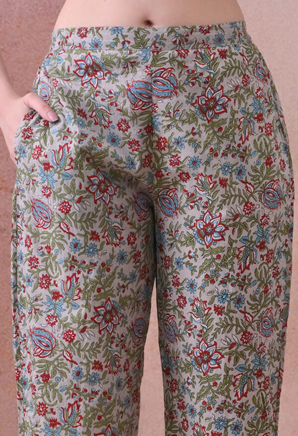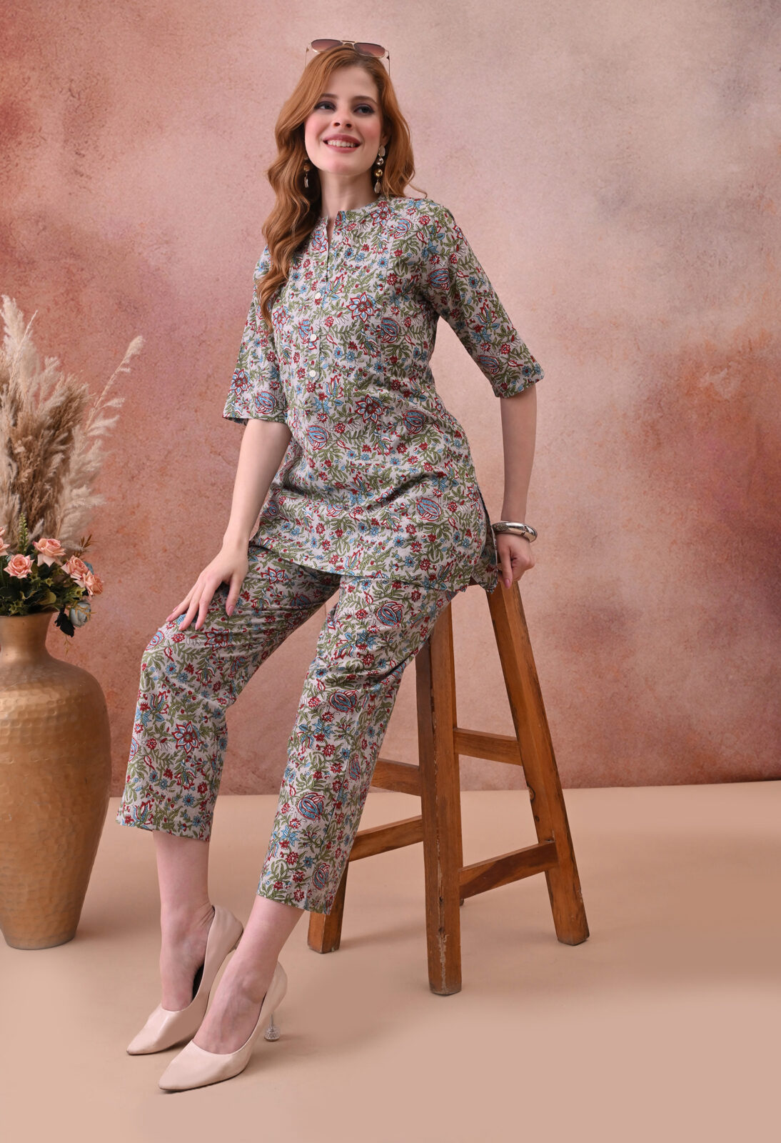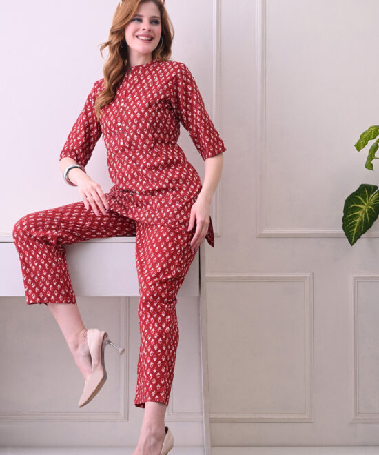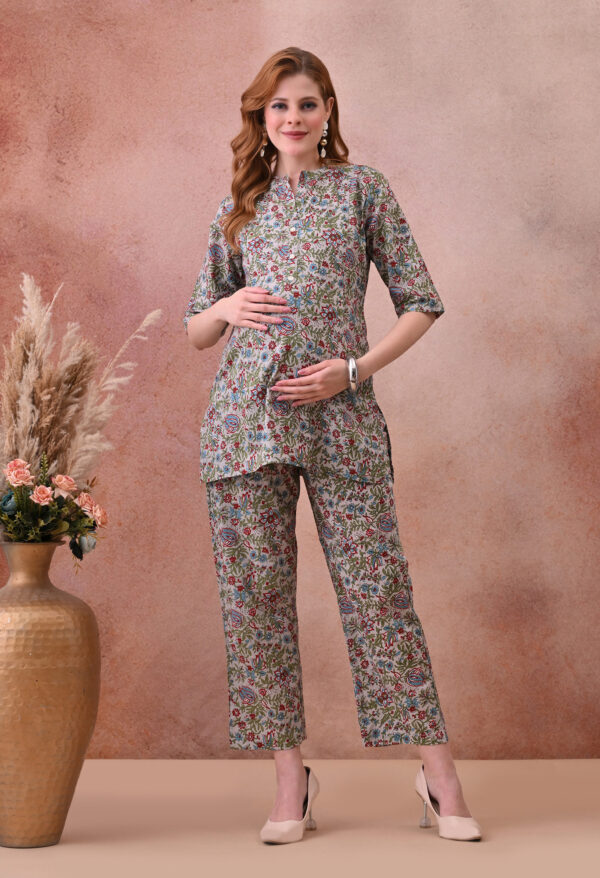The matching straight-leg trousers feature an elasticated waist for comfortable, flexible wear across all trimesters and postpartum. This co-ord set from Murli Kurti is a beautiful and practical choice for moms who want breathable comfort, stunning print, and seamless nursing access every day.