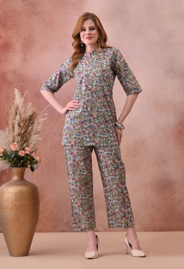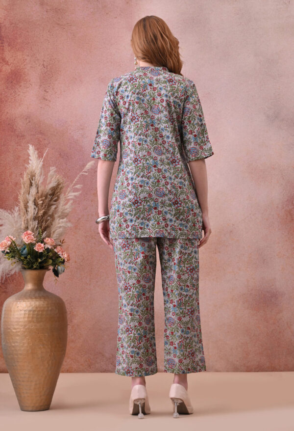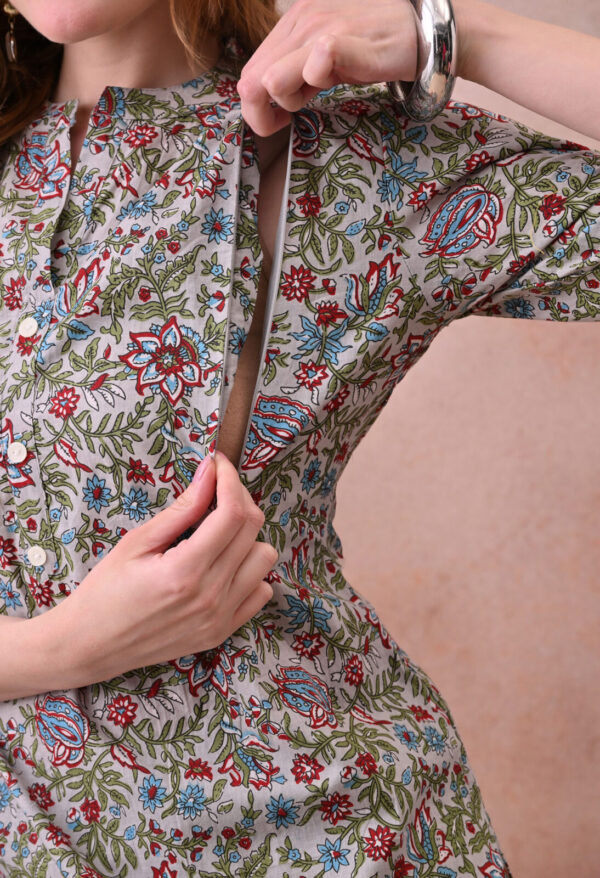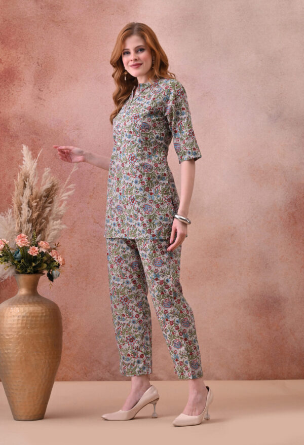 Step into effortless maternity style with this Murli Kurti off white multicolour floral print cotton nursing co-ord set. The A-line kurti is crafted from soft breathable cotton and features a front button placket with nursing access, making breastfeeding easy and completely discreet without disturbing your outfit. The mandarin collar with V-notch and half sleeves give it a clean, elegant finish perfect for both home wear and outings.