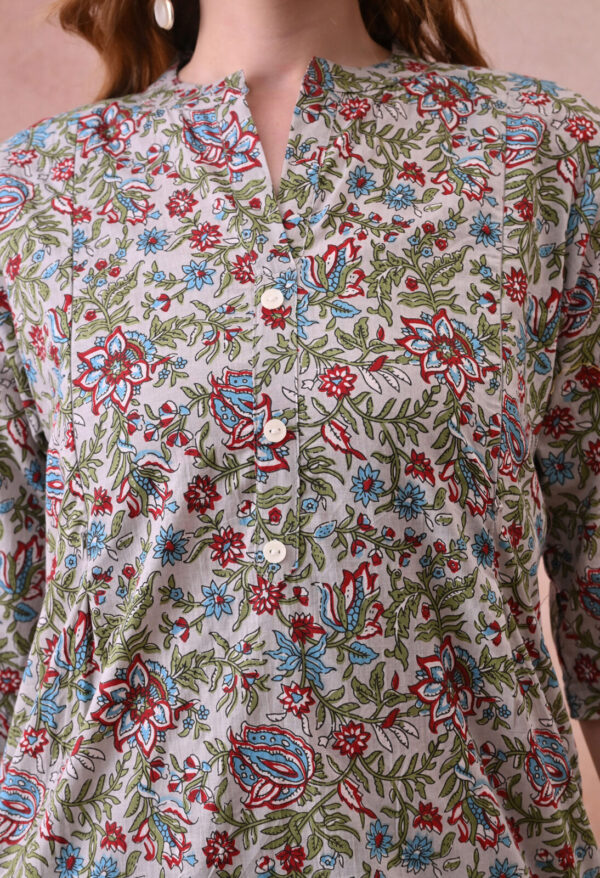 • Mandarin collar with V-notch and half sleeves for an elegant finish