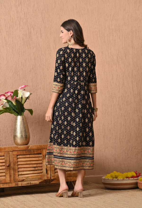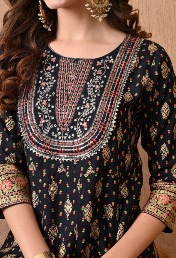 Round neckline with heavy ethnic yoke print