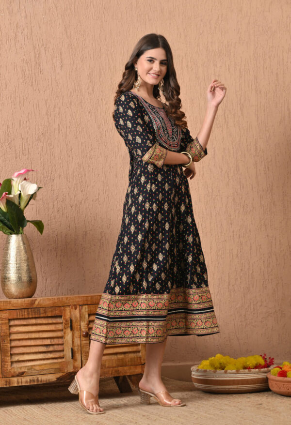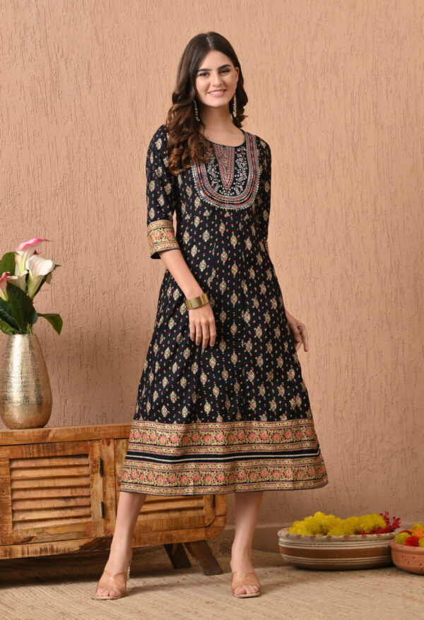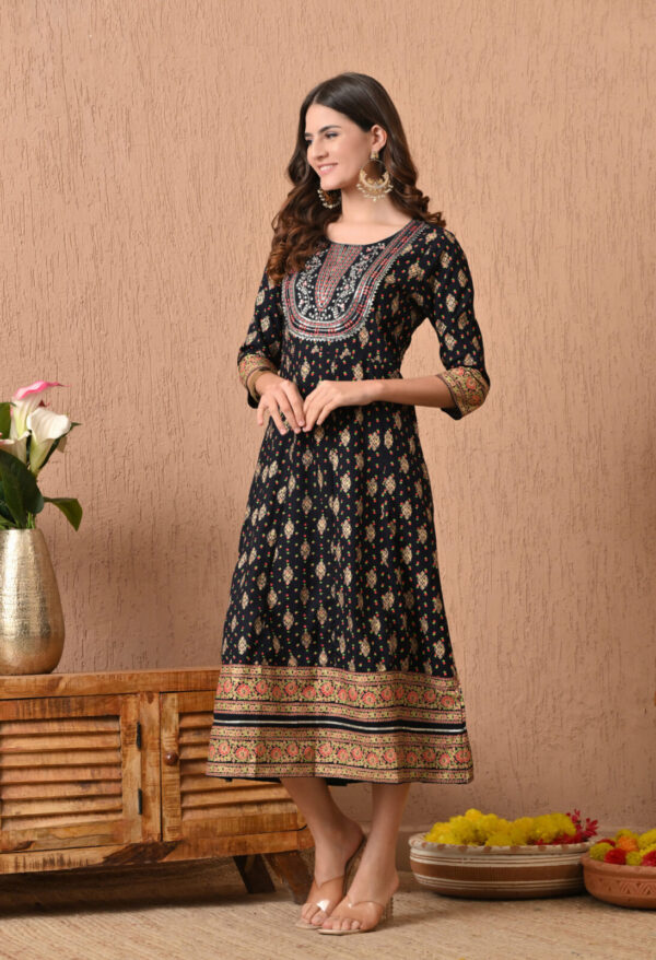 Step into timeless elegance with this stunning Black Floral Ethnic Printed Anarkali Kurti from Murlikurti. Designed with intricate traditional motifs all over and a beautifully detailed yoke pattern, this kurti brings festive charm with everyday comfort.