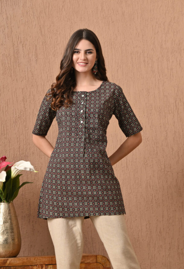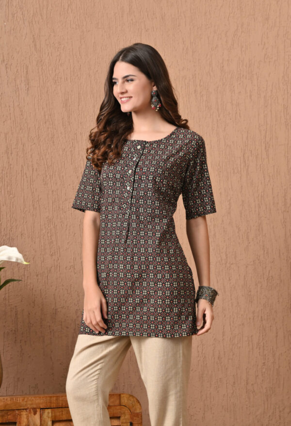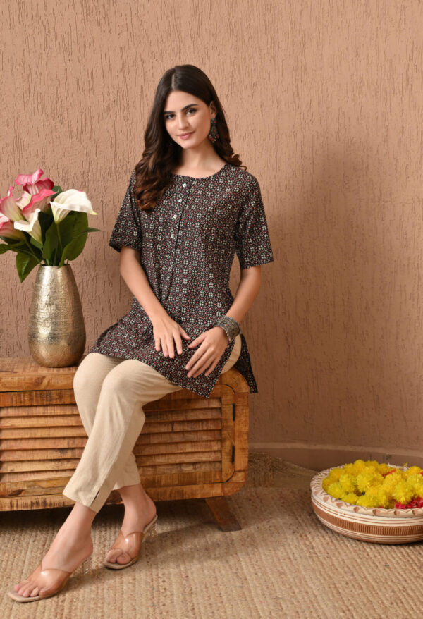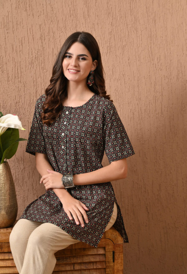 The subtle red and beige motifs on a deep black base give it a refined and versatile appeal — perfect for office wear, casual outings, and daily comfort dressing. The front button detailing adds a smart, structured finish.