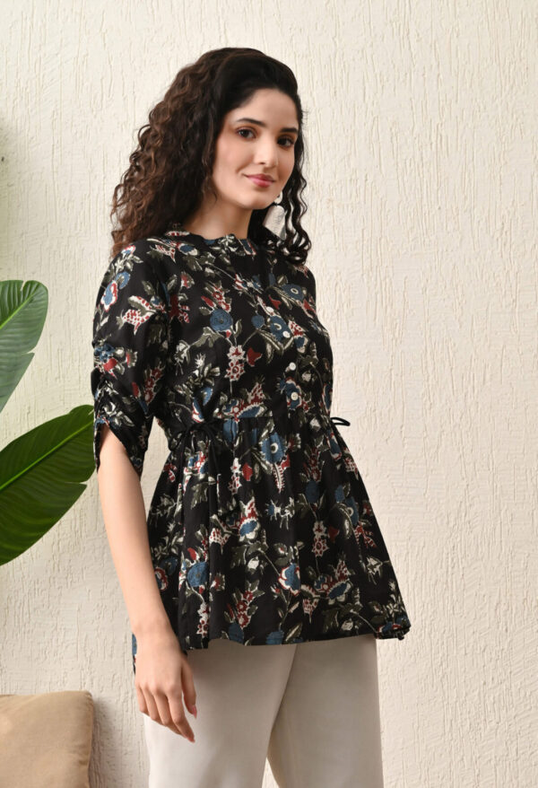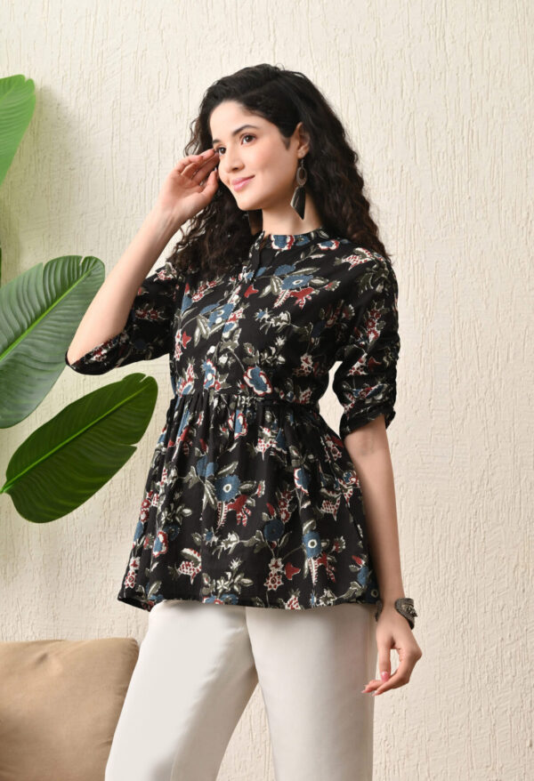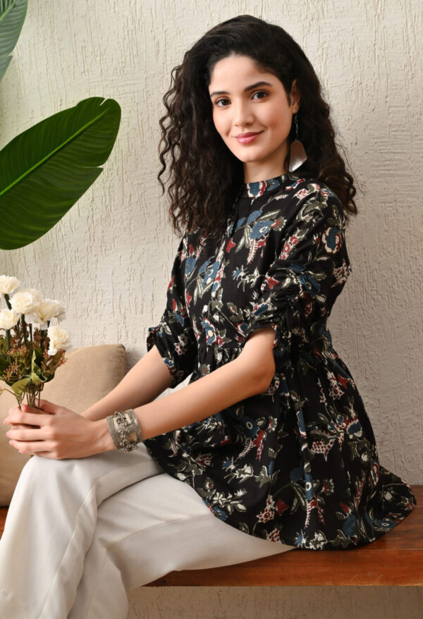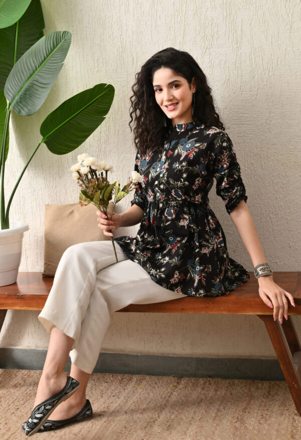 Make a bold yet elegant statement with this stunning Black Multicolor Floral Printed Short Kurti from Murlikurti. Designed in premium breathable cotton, this kurti features a flattering flared silhouette with gathered waist detailing for a stylish and comfortable fit.