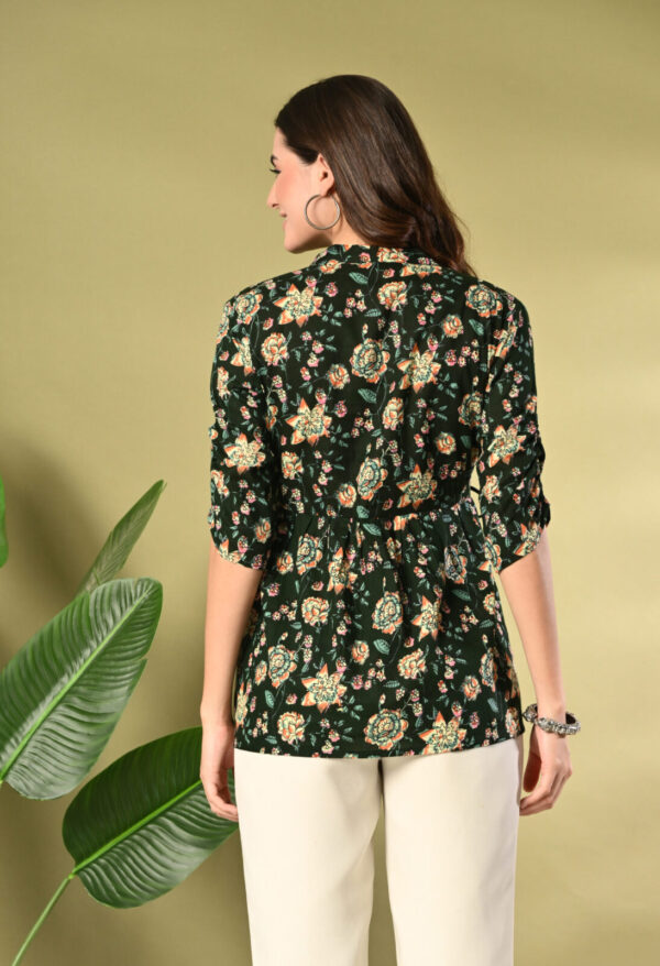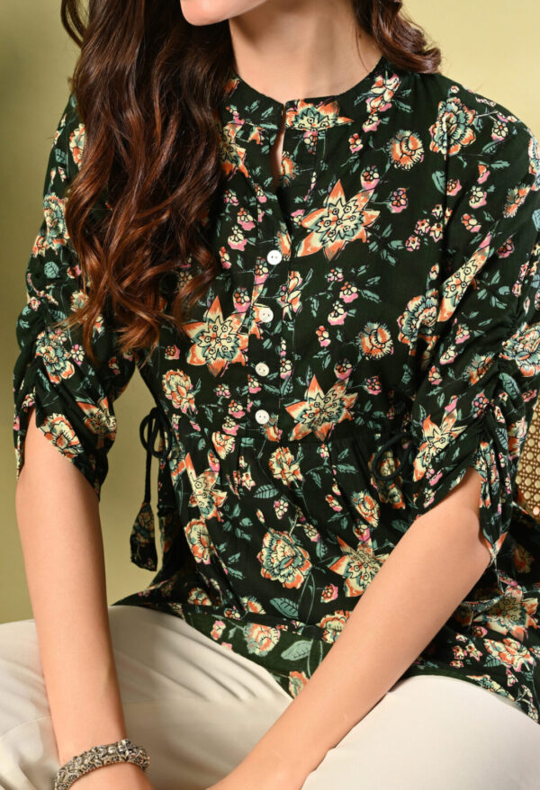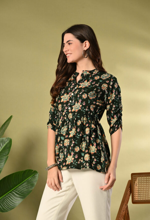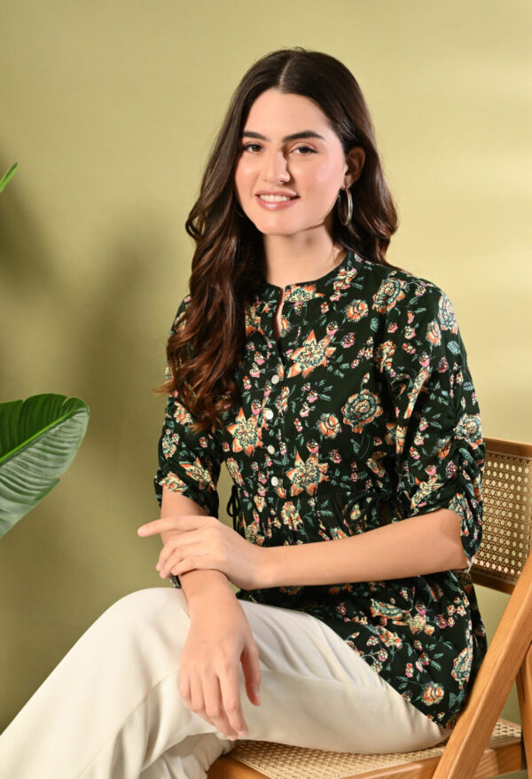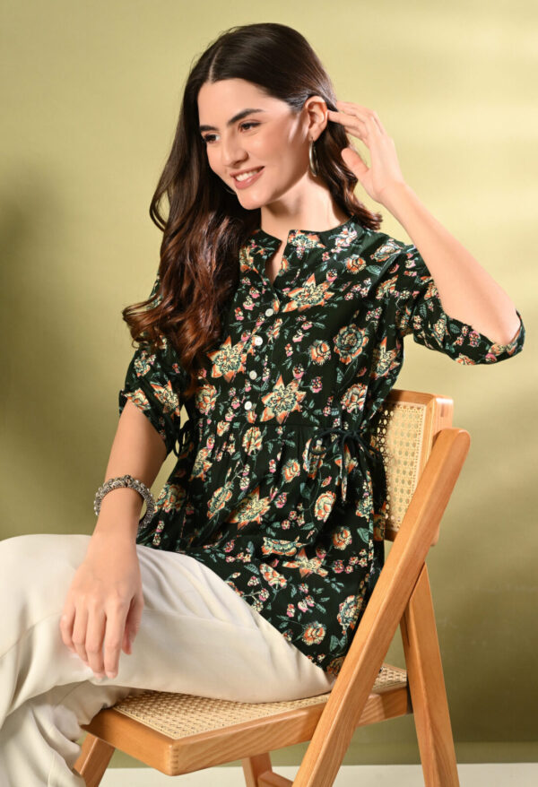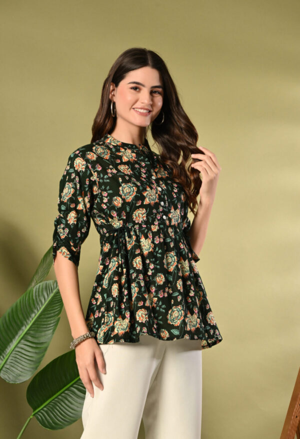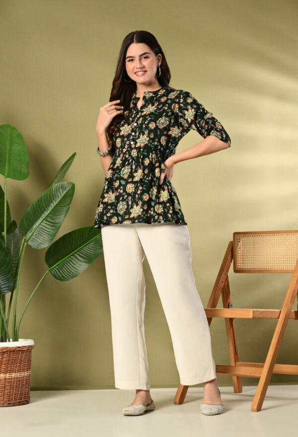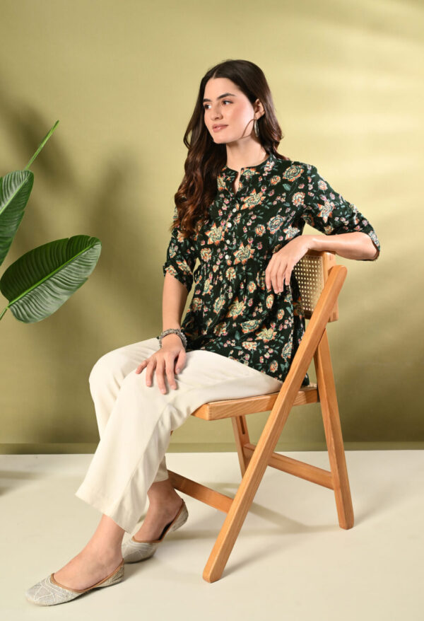Step into effortless elegance with this beautiful Dark Green Floral Peplum Kurti from Murlikurti. Featuring a rich dark green base with vibrant floral prints, this kurti is designed to give you a flattering and graceful silhouette.