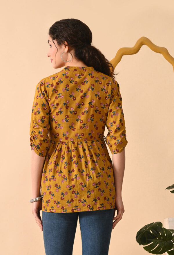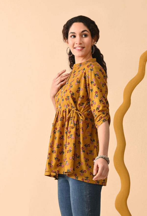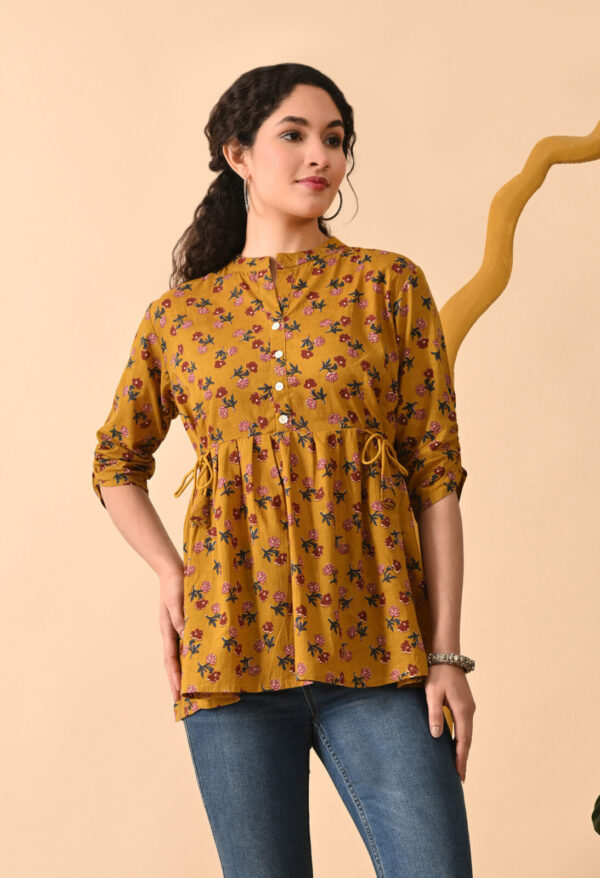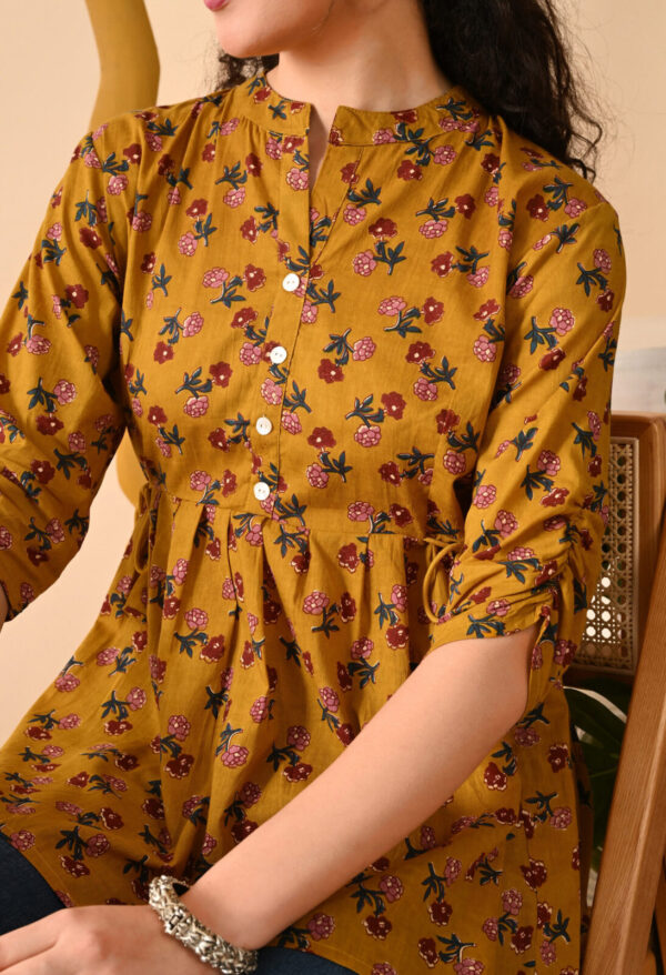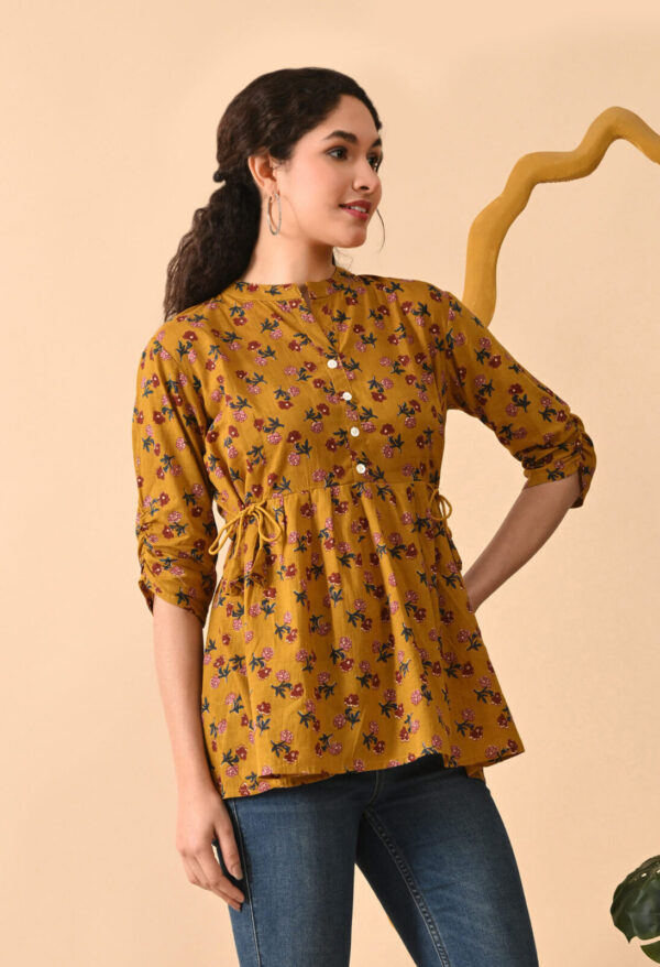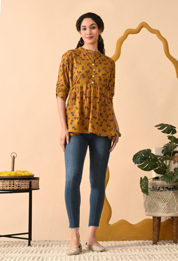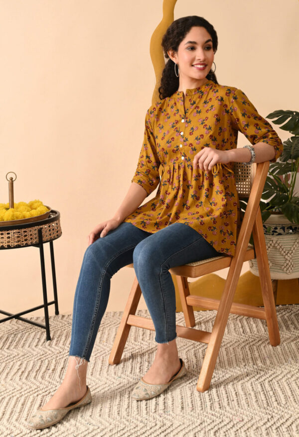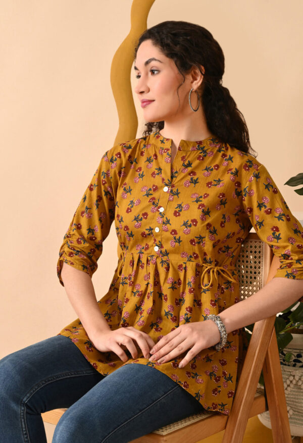 Add a touch of warmth and elegance to your everyday wardrobe with this beautiful Mustard Brown Floral Printed Short Kurti from Murlikurti. Crafted in soft breathable cotton, this kurti features a graceful flared silhouette with adjustable side tie-up detailing for a flattering and comfortable fit.