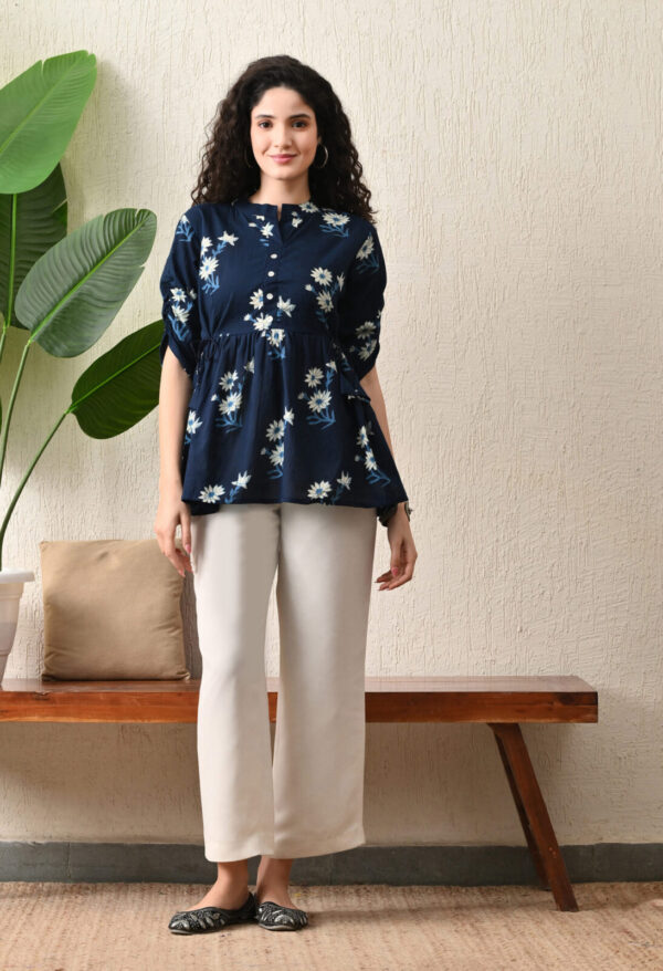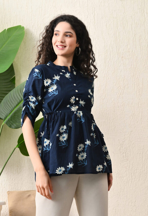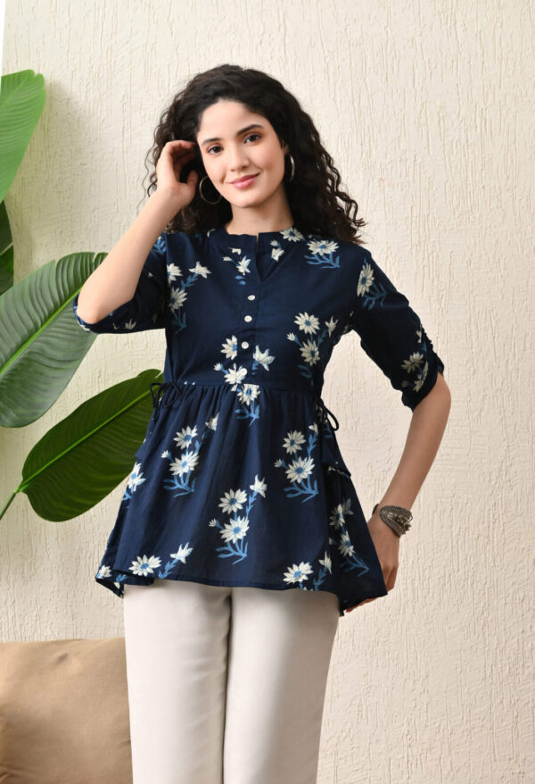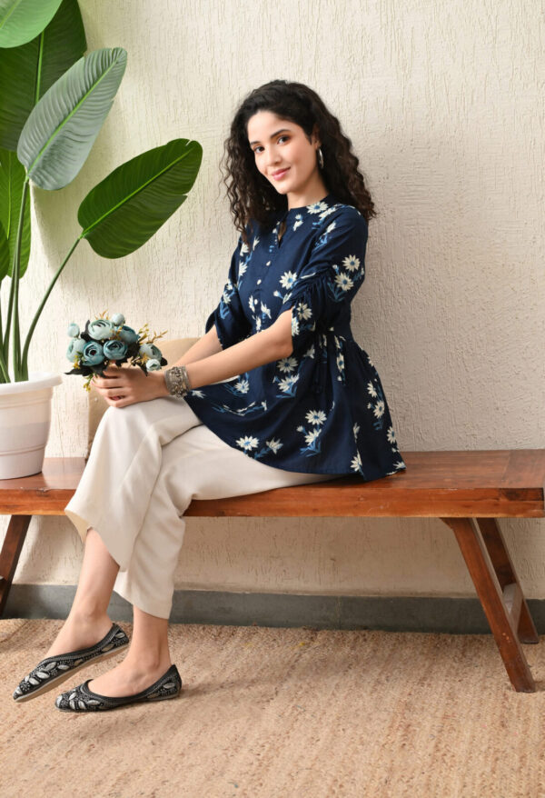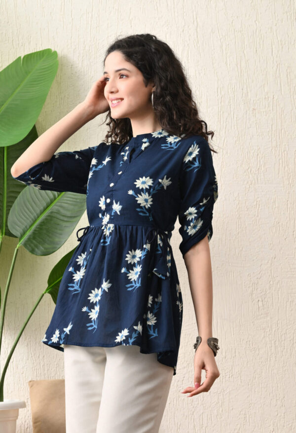 Upgrade your everyday ethnic style with this elegant Navy Blue Floral Peplum Kurti. Designed with a flattering flared silhouette, this kurti features a beautiful white floral print that adds a soft, feminine charm. The waist tie-up detailing enhances the fit, while the flowy hemline gives a graceful and comfortable look.