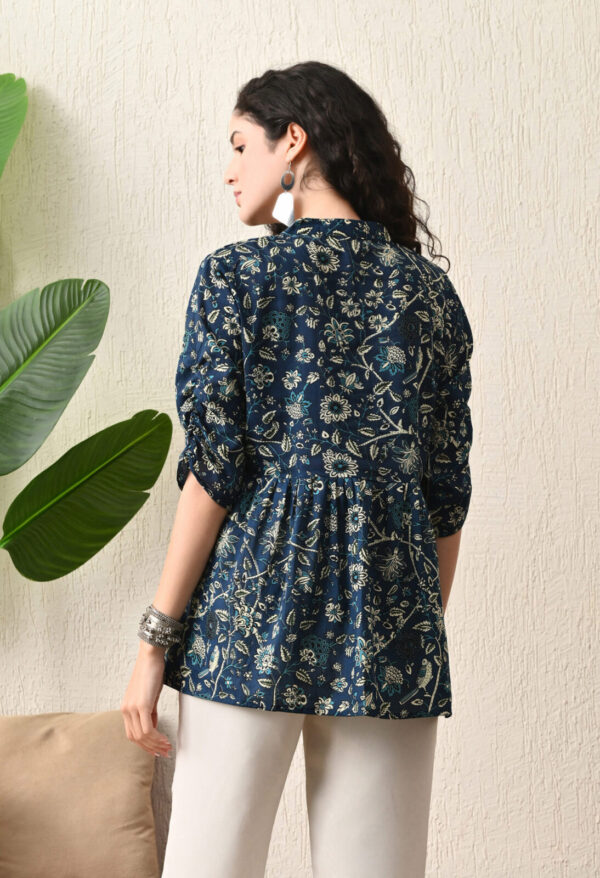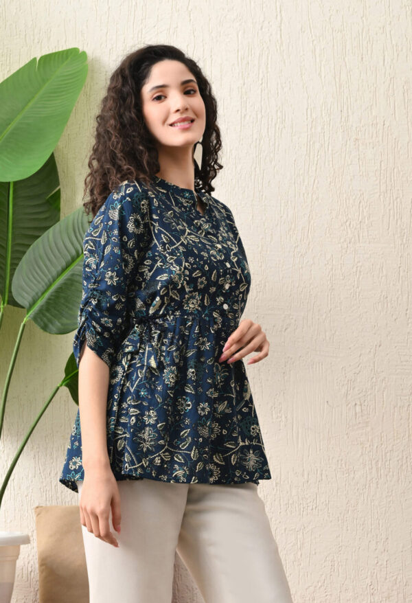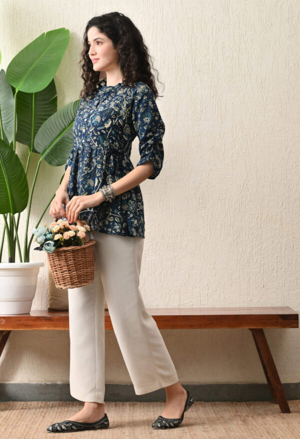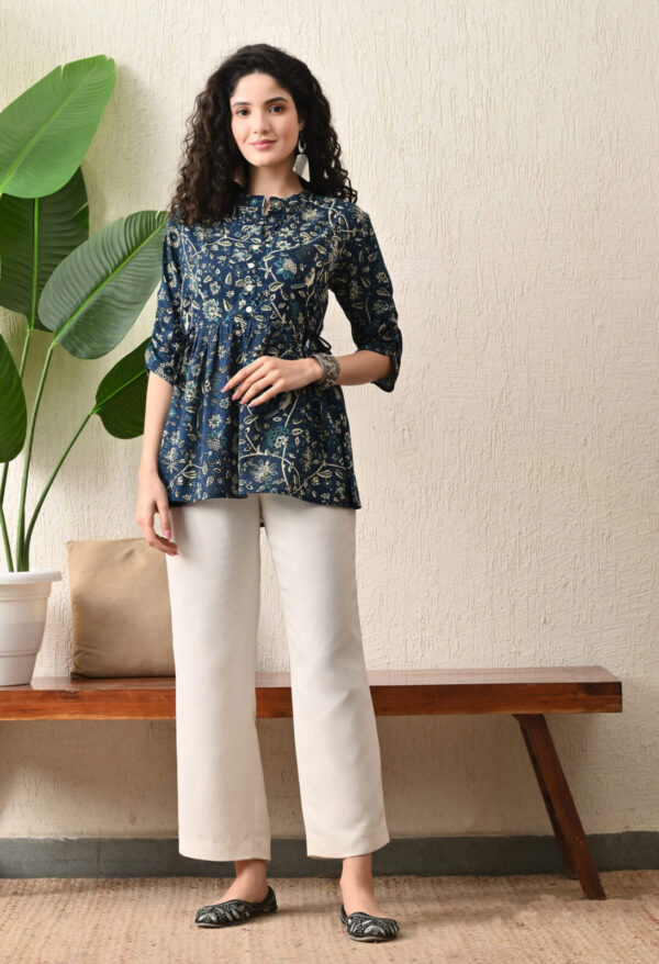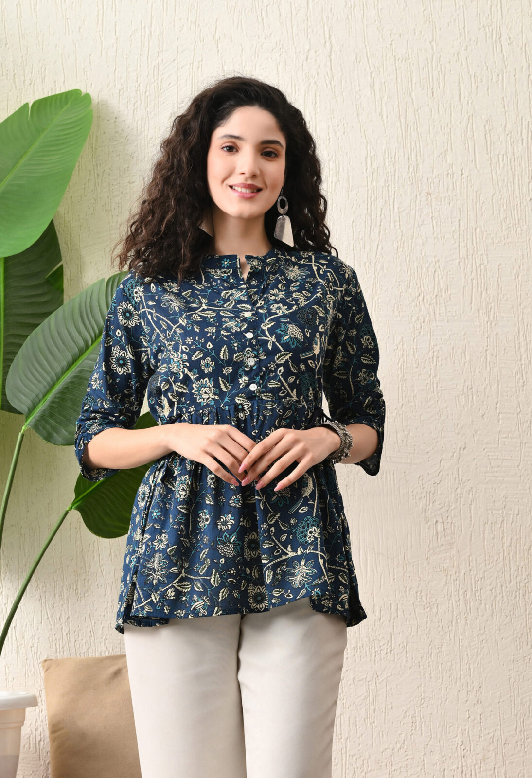 Elevate your everyday ethnic style with this elegant Navy Blue Floral Peplum Kurti from Murlikurti. Designed with a graceful flare and delicate floral print, this kurti blends modern charm with traditional elegance.