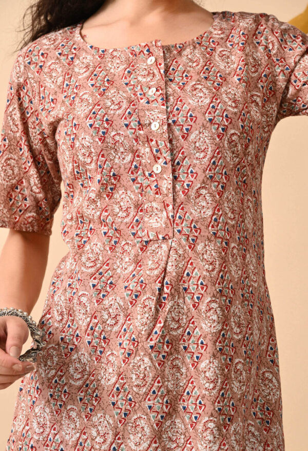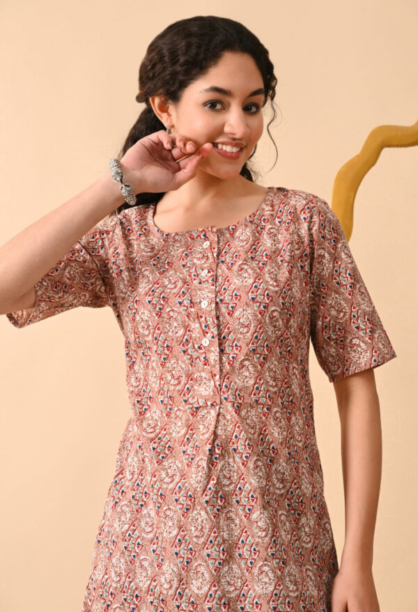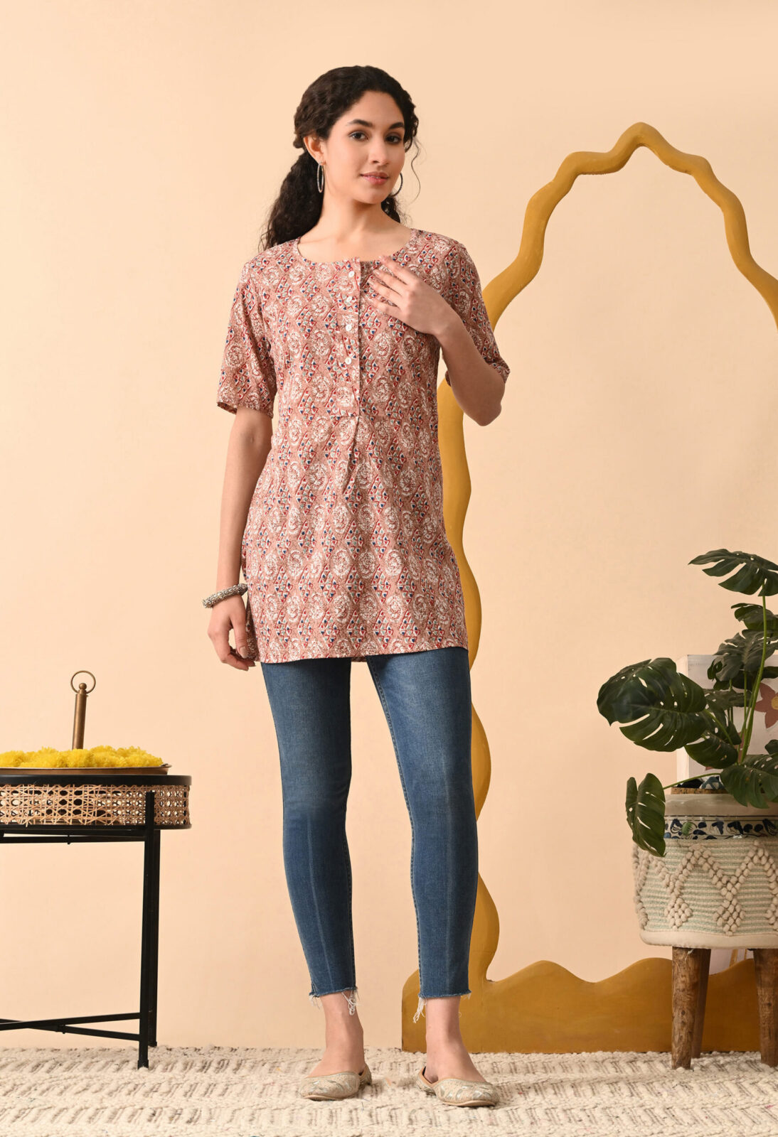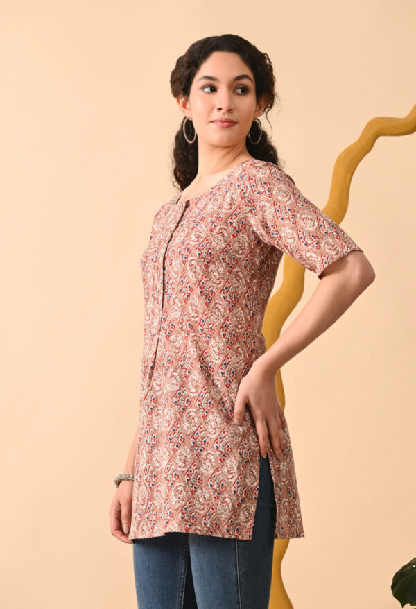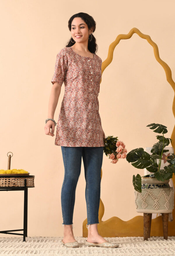 Step into effortless elegance with this beautiful Peach Brown Ethnic Printed Straight Kurti from Murlikurti. Designed with intricate traditional motifs in soft earthy tones, this kurti offers a refined and graceful everyday look.