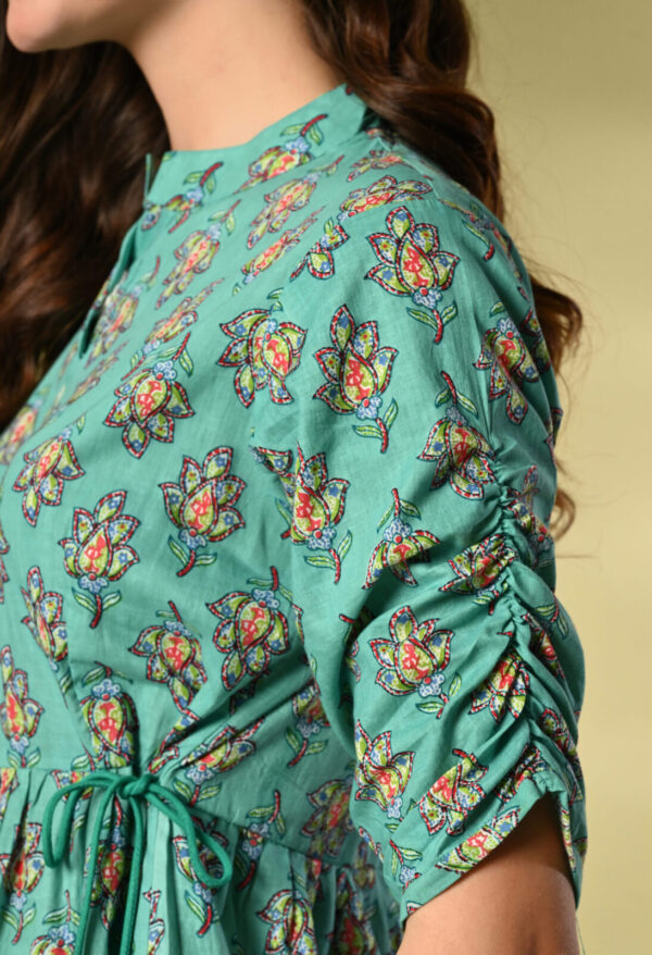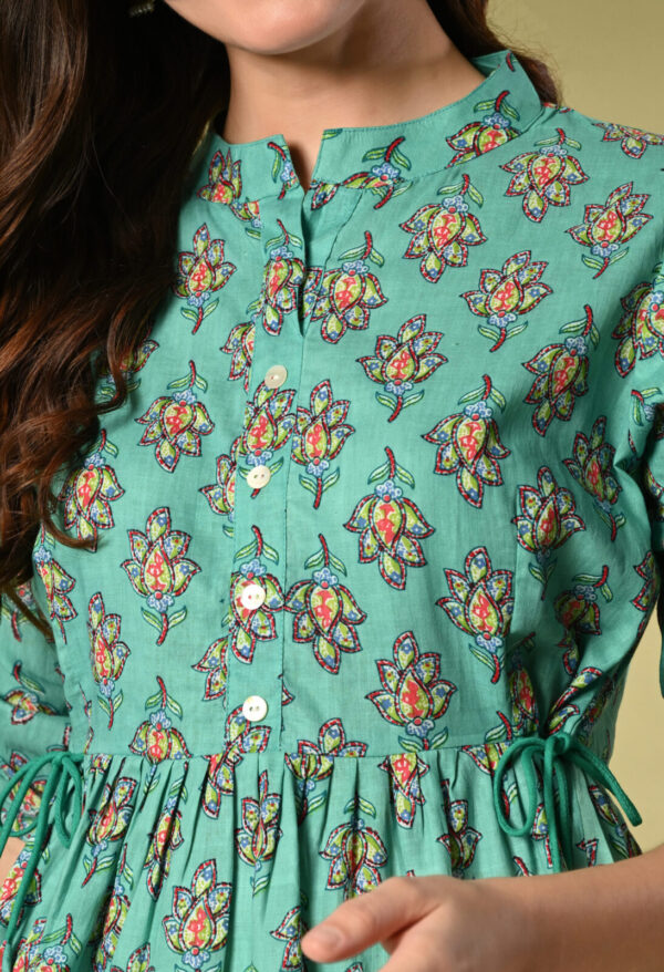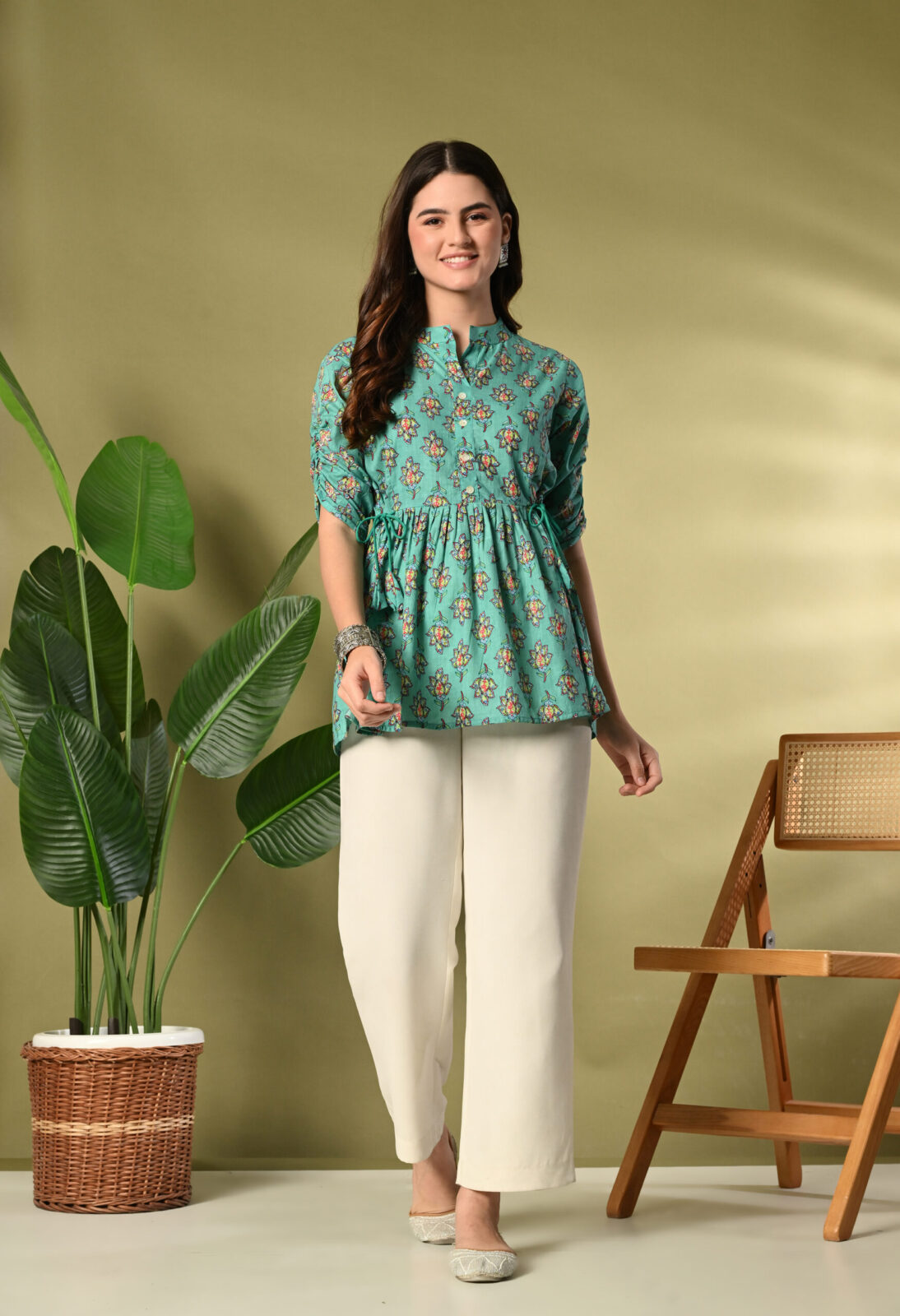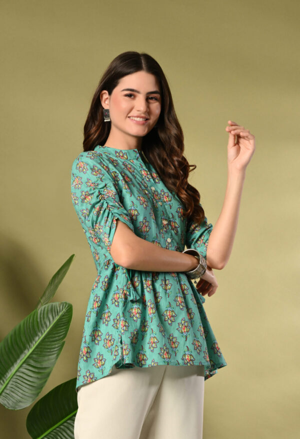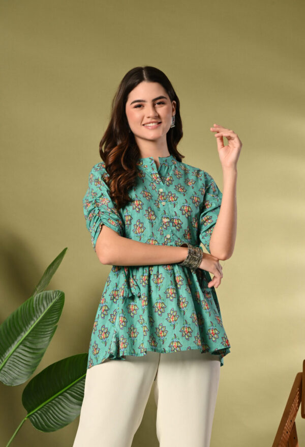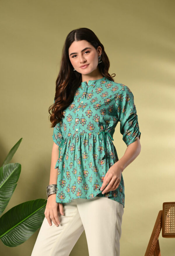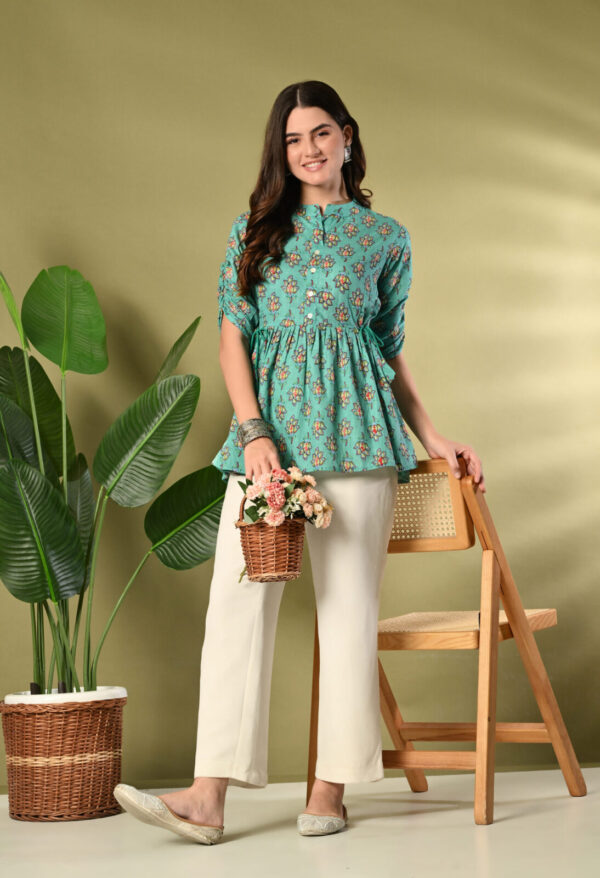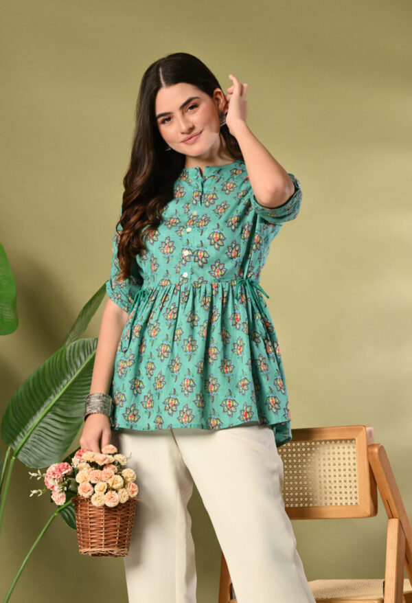 Bring freshness and elegance to your wardrobe with this beautiful Teal Green Floral Peplum Kurti from Murlikurti. Designed with a soft gathered waist and adjustable side tie-up, this kurti offers a flattering silhouette while ensuring maximum comfort.