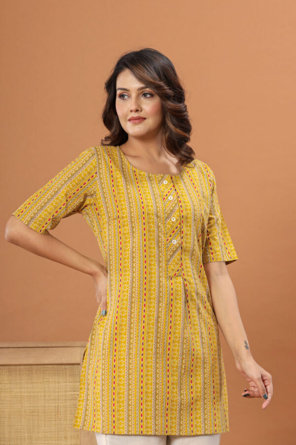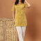 This kurti features a straight-cut silhouette that offers a flattering and relaxed fit. The design is complemented by a modest round neckline and a functional front button placket, adding a touch of classic detail. With elbow-length sleeves and side slits for effortless movement, this piece is a versatile staple for office wear, casual lunch dates, or festive daytime gatherings. Pair it with white trousers or leggings to let the vibrant mustard hue truly stand out.