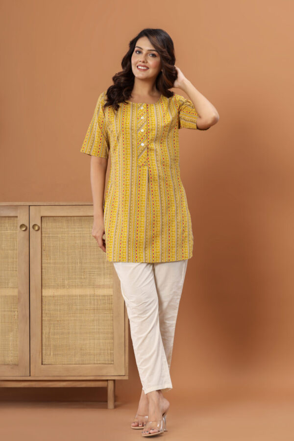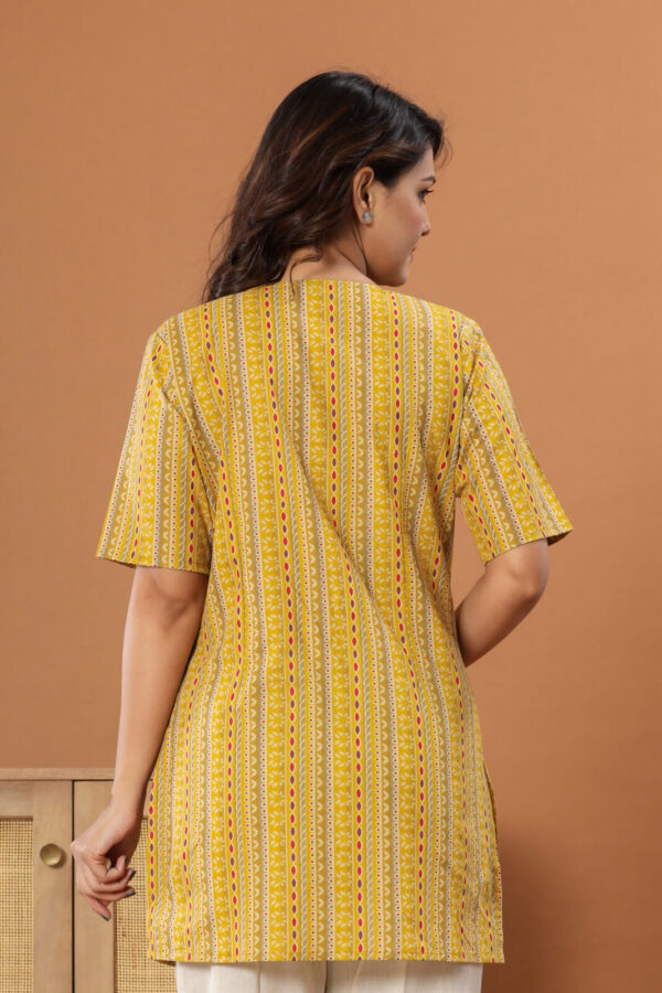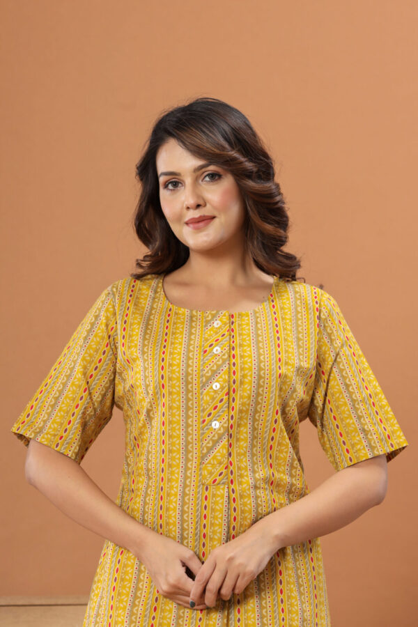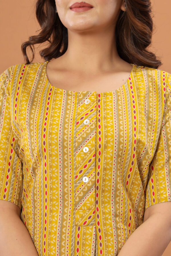 Infuse your everyday look with a burst of sunshine in our Mustard Yellow Geometric Kurti. Expertly tailored from 100% premium soft cotton, this kurti is designed to keep you cool and comfortable all day long. It features an eye-catching vertical pattern that blends traditional block-print aesthetics with modern stripes, incorporating shades of rust red, olive green, and ivory.