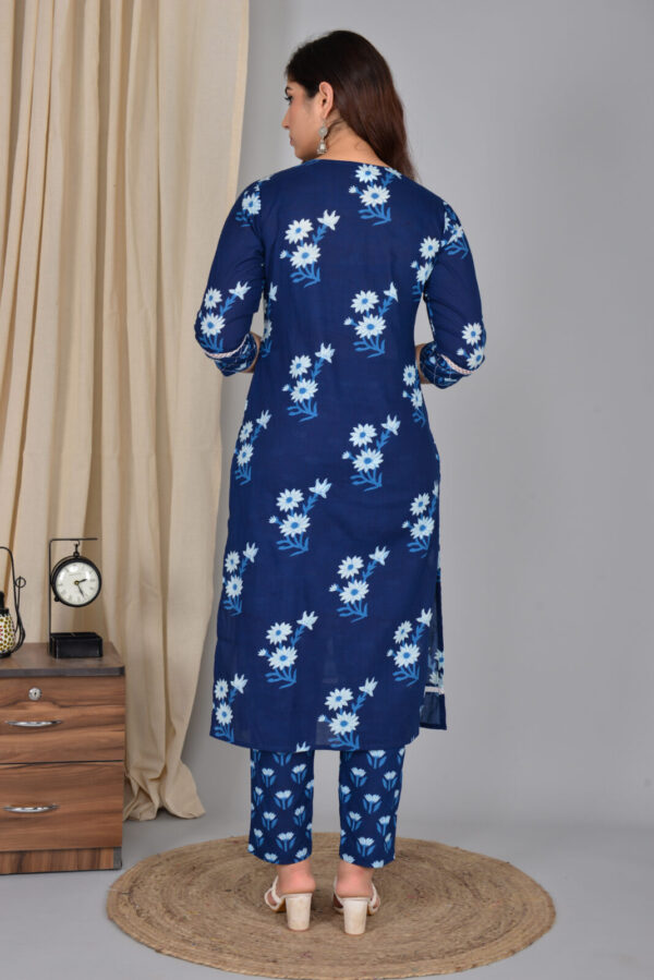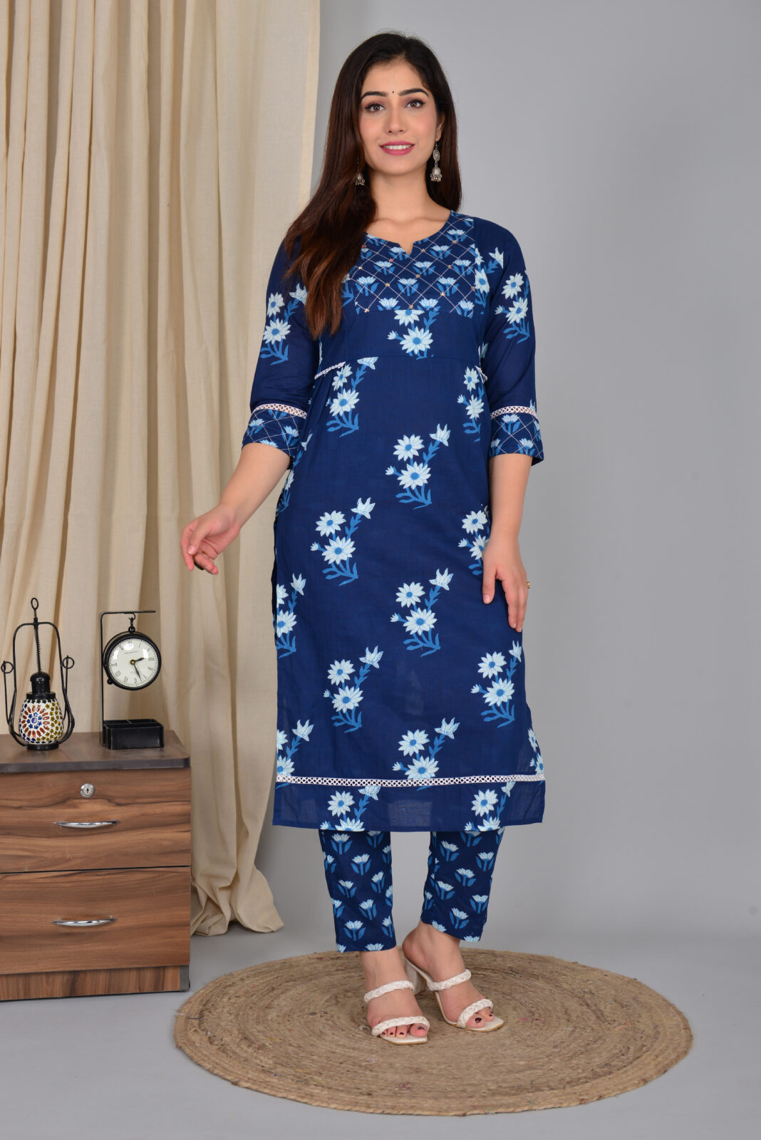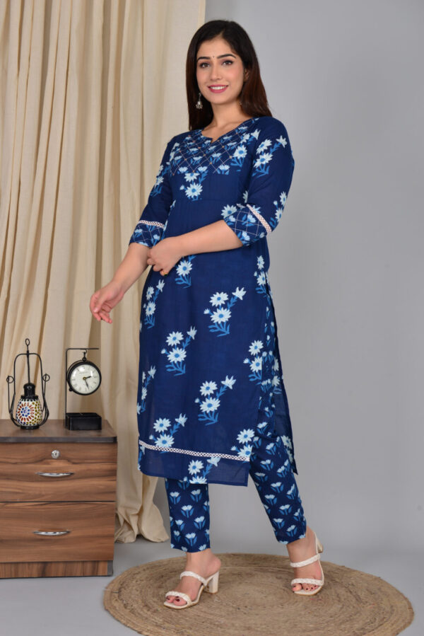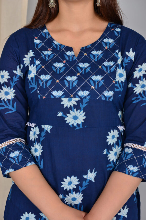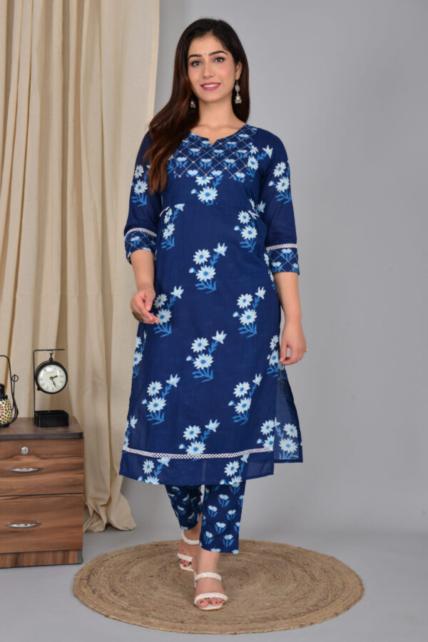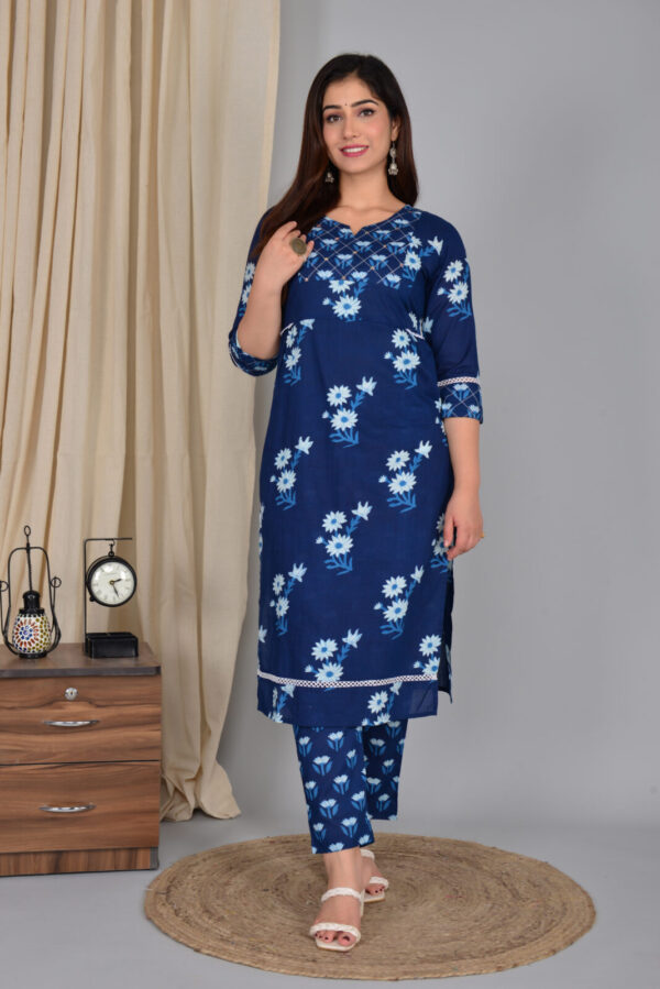Navy blue daisy print cotton kurta set designed for easy everyday elegance. The straight kurta features a flattering V‑neck with an embroidered yoke, 3/4 sleeves, and delicate lace detailing at the sleeves and hem for a refined touch. Crafted from breathable cotton, it keeps you cool and comfortable through long workdays, outings, or small gatherings. The matching tapered pants come in a coordinated floral print, giving a streamlined, put‑together look without extra styling effort. Pair this set with block heels or flats and statement earrings to move effortlessly from day to evening.