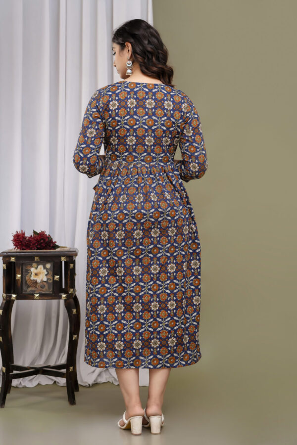 Command attention with this navy blue floral print cotton maternity maxi dress. Lightweight cotton delivers breathable ease over your bump, perfect for nursing and extended wear. Empire waist gathers ensure a poised, body‑hugging flow.