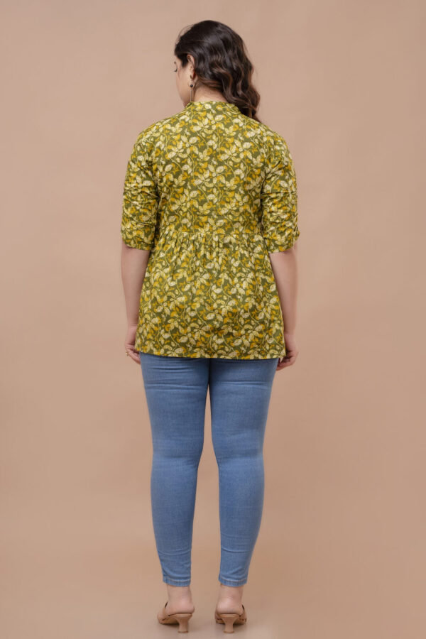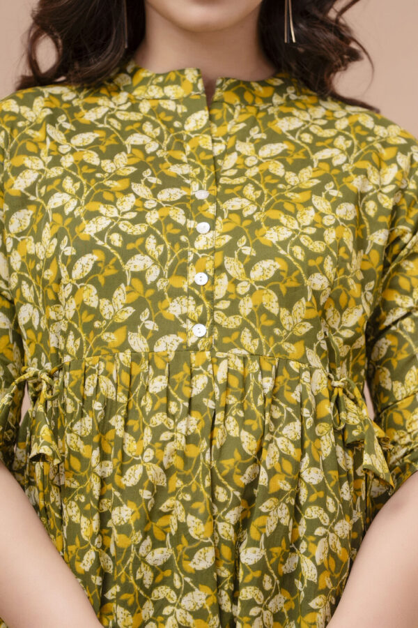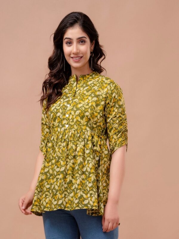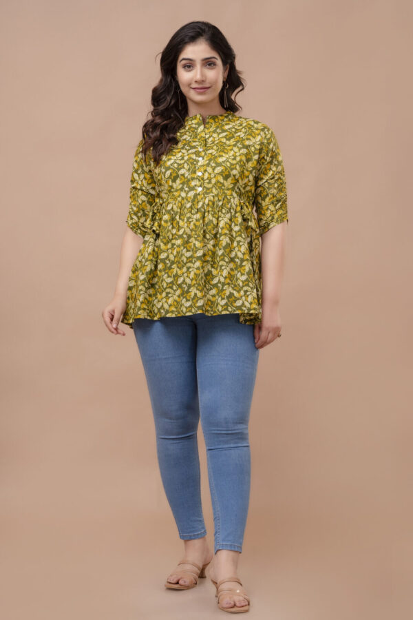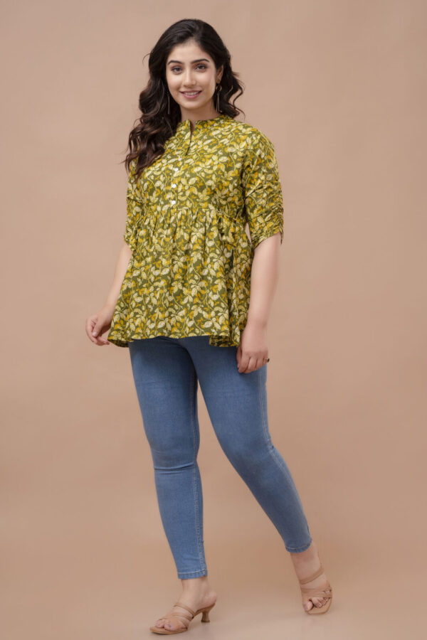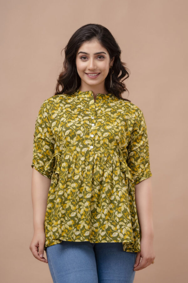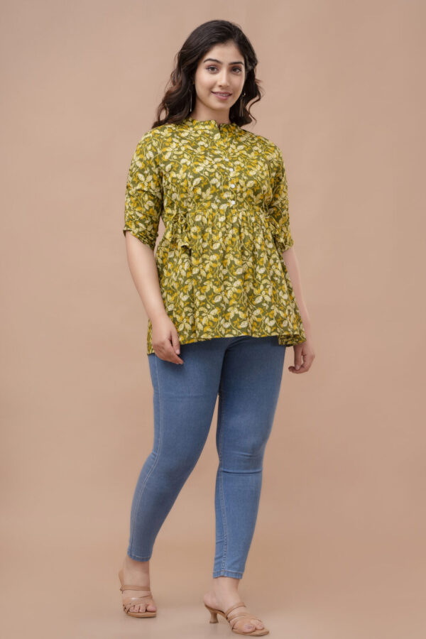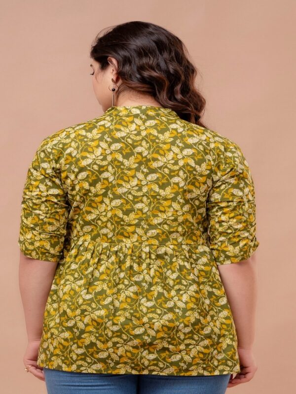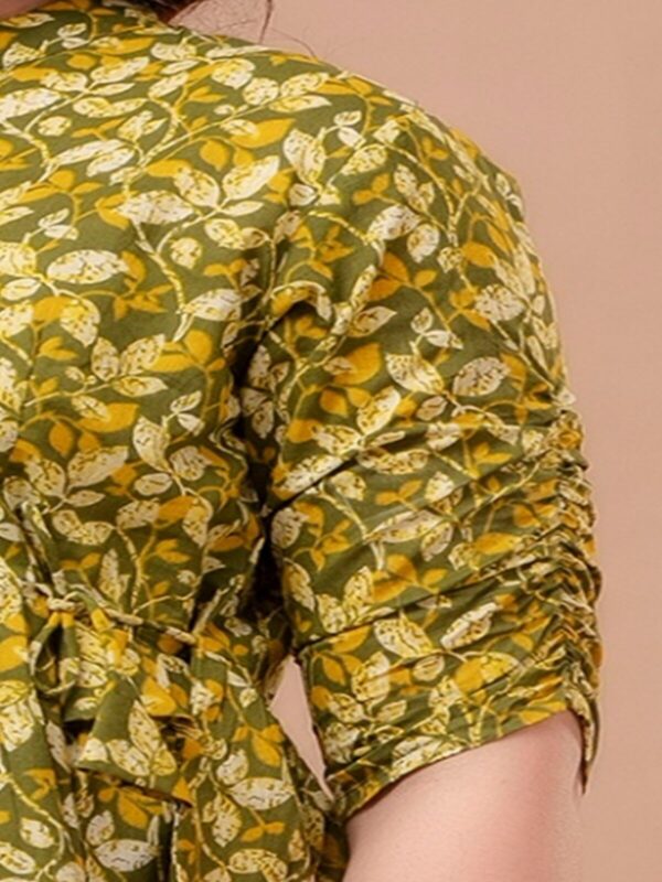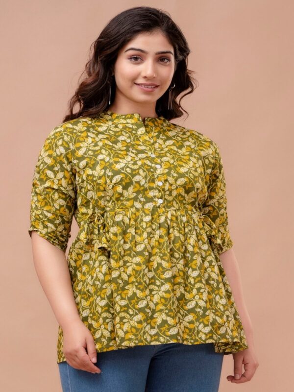 Embrace a fresh, earthy aesthetic with our Olive Green Leafy Peplum Top. Crafted from 100% premium breathable cotton, this top features a dense and vibrant all-over leaf pattern in shades of olive, mustard, and ivory. Its soft, natural fabric ensures exceptional comfort, making it an ideal choice for your daily maternity wardrobe.
