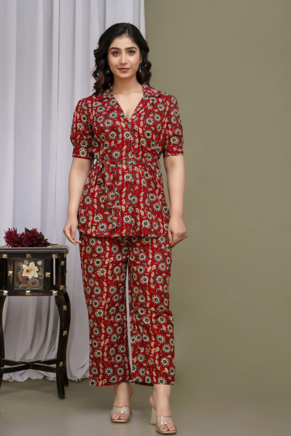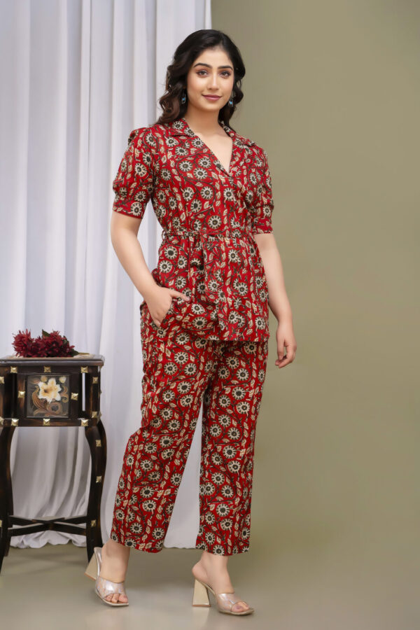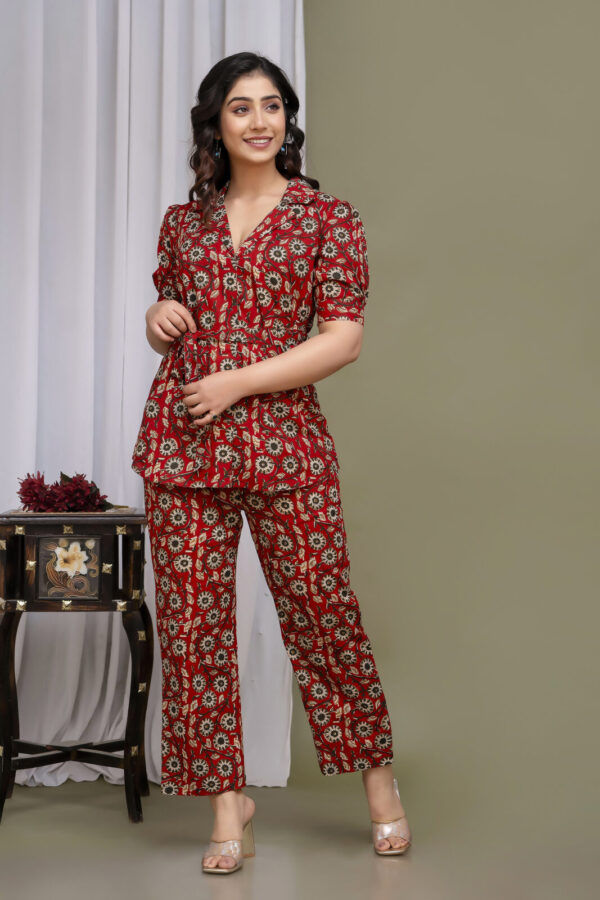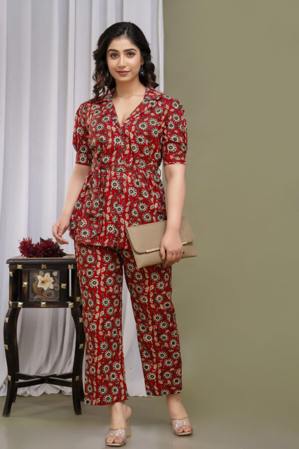 Bring a bold pop of colour to your wardrobe with this red floral print cotton co-ord set, designed for comfort and chic everyday style. The breathable cotton fabric feels soft on the skin and keeps you cool through long days, making it ideal for work, outings, or festive gatherings.