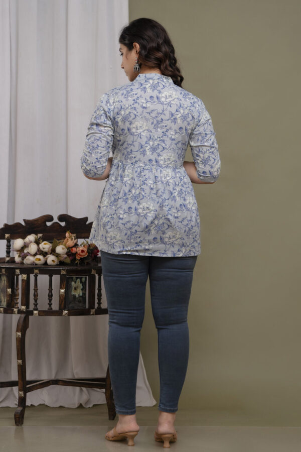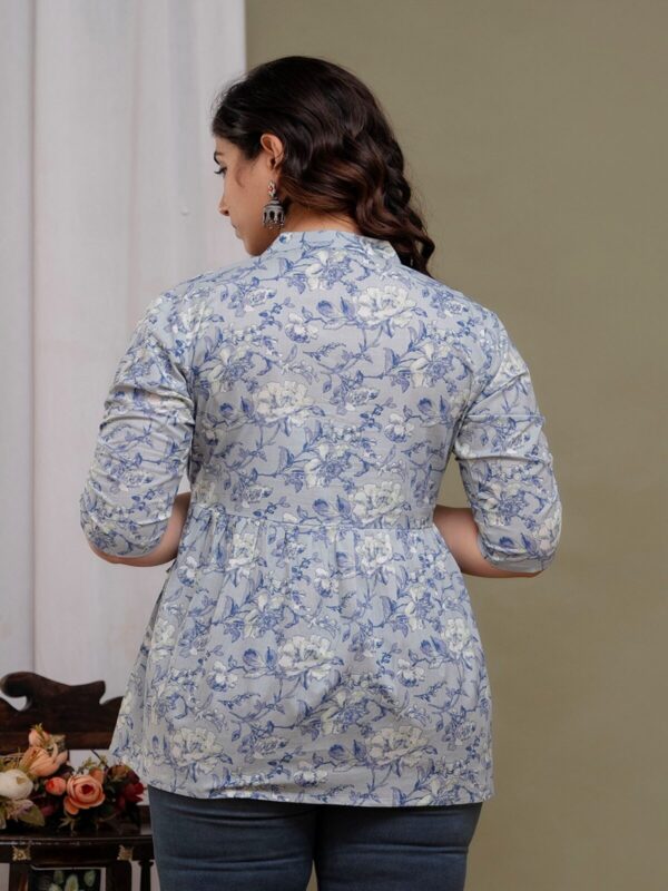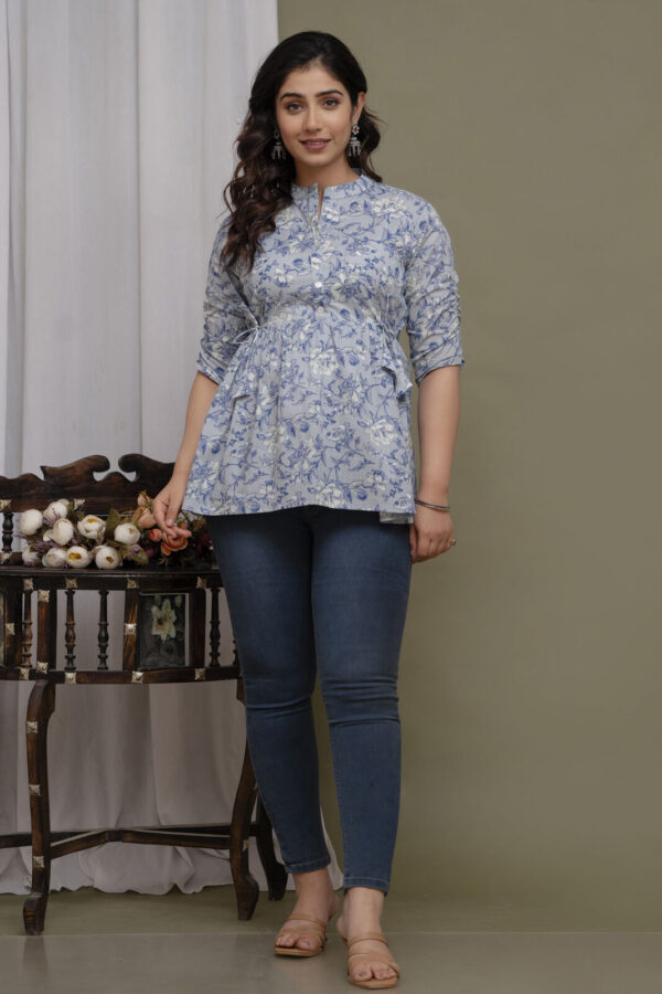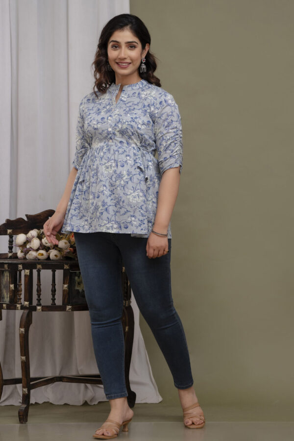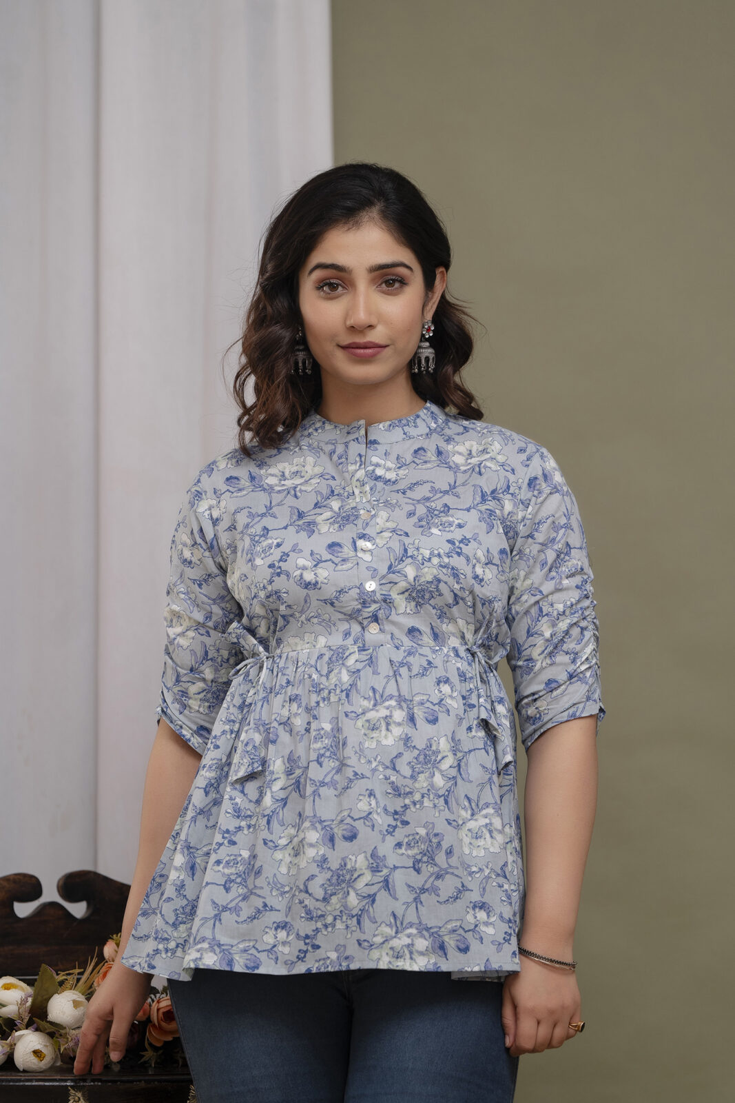 Effortlessly transition through every stage of motherhood with our Sky Blue Floral Peplum Top. Crafted from 100% premium breathable cotton, this top features a delicate vintage-inspired floral print in shades of blue and white, offering a soft and refreshing aesthetic for any occasion.