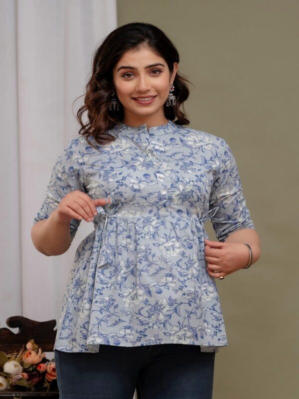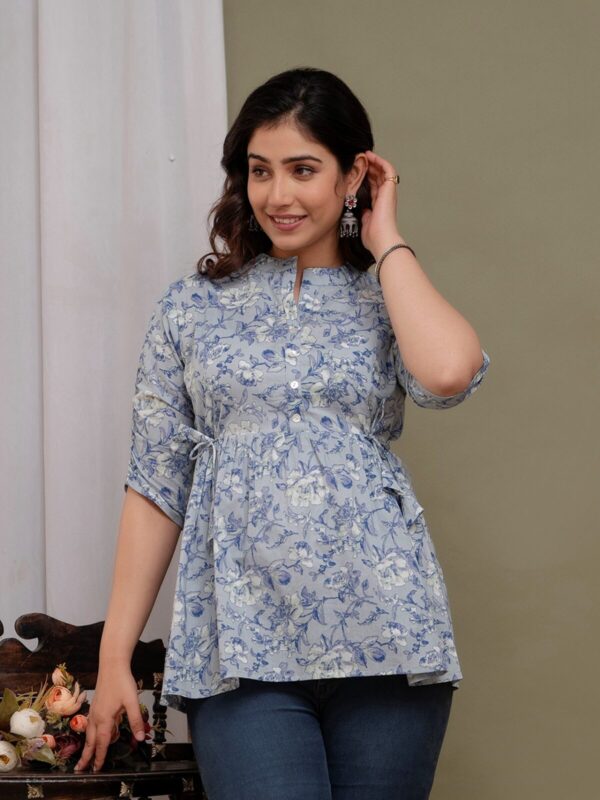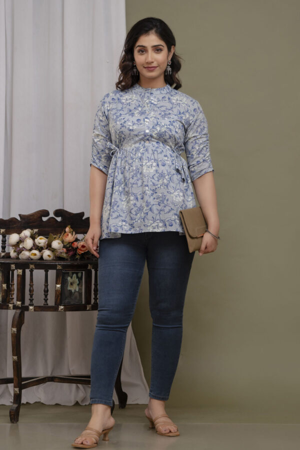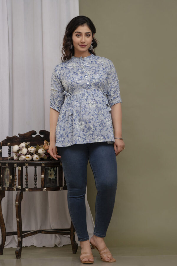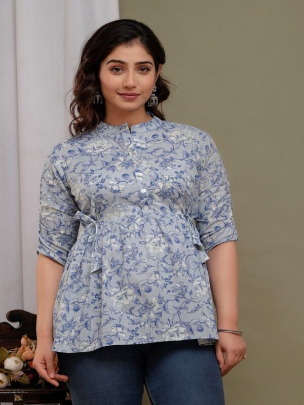 Be the first to review “Serene Sky Blue Floral Cotton Maternity & Nursing Peplum Top”