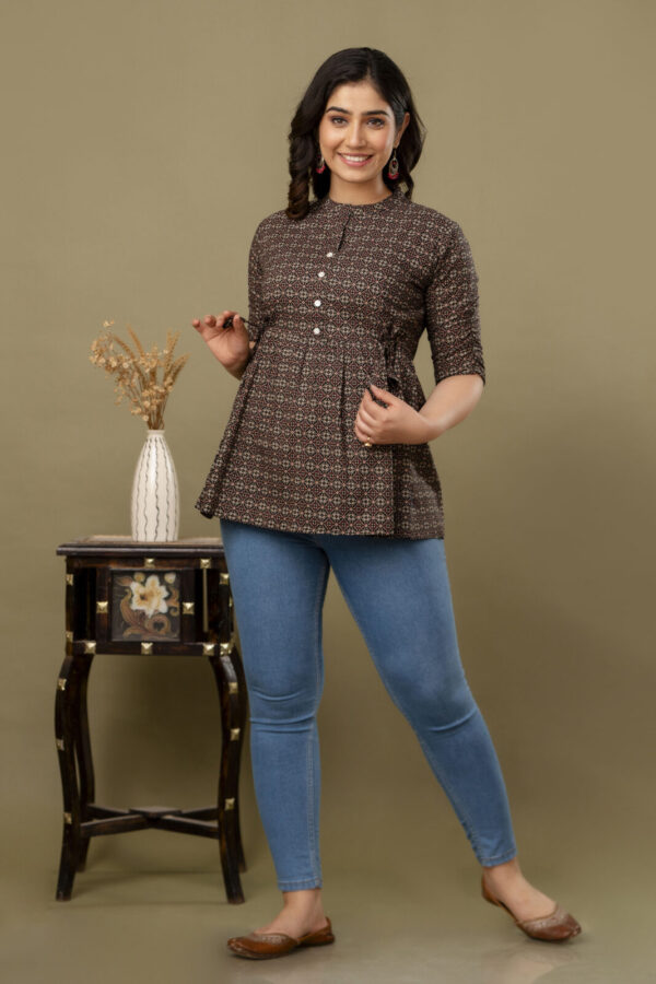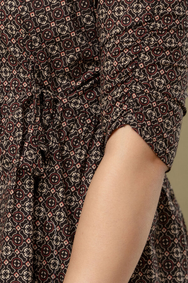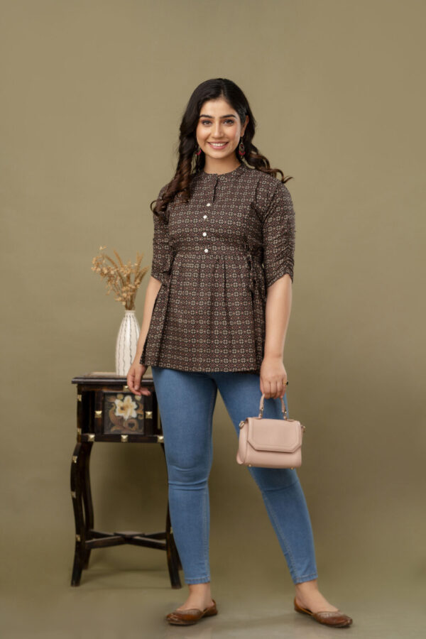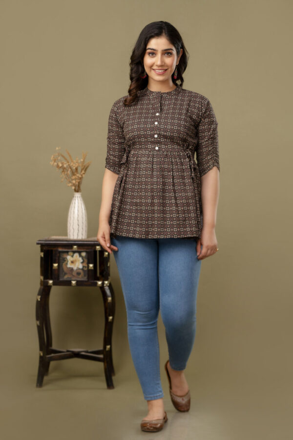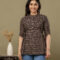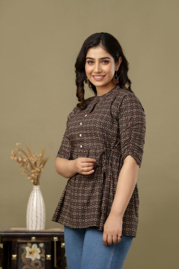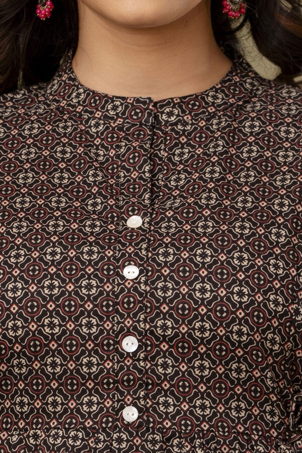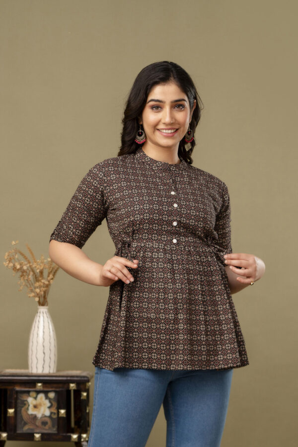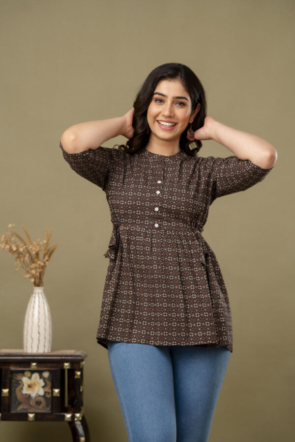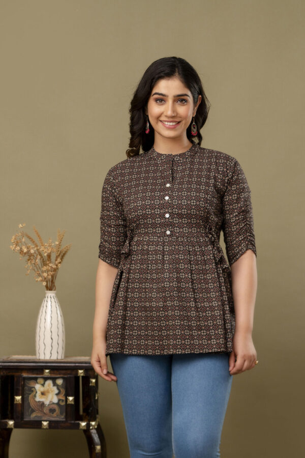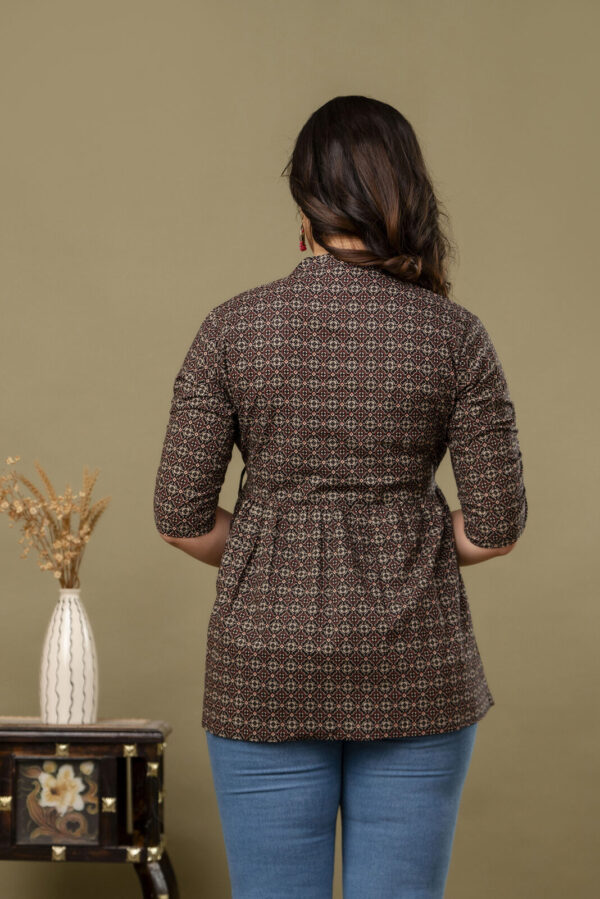 Add a touch of ethnic sophistication to your casual wardrobe with our Black Ajrakh Print Peplum Tunic. This stylish top features a complex, traditional geometric Ajrakh motif in earthy red and cream tones. Its modern peplum silhouette makes it a versatile piece that pairs perfectly with jeans, leggings, or trousers for a chic Indo-western look.
