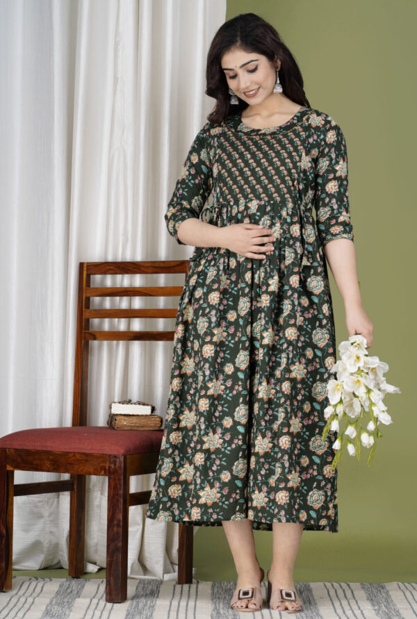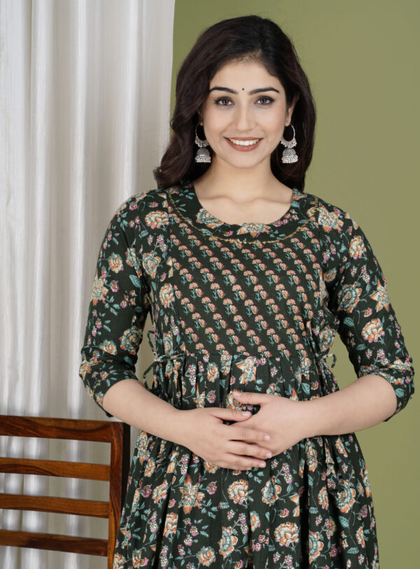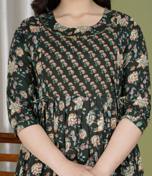 Exude timeless elegance with this bottle green Anarkali kurta, a perfect blend of traditional prints and a contemporary silhouette. This flared kurta features a unique design with a patterned yoke and a voluminous floral body, making it a sophisticated choice for festive gatherings, office ethnic days, or casual evening celebrations.