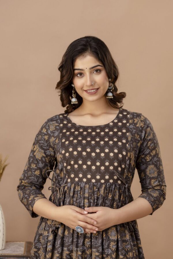 Embrace understated elegance with our Charcoal Grey Anarkali Dress, a perfect blend of earthy tones and sophisticated floral artistry. This ankle-length ensemble features a rich grey base accented with warm mustard and beige botanical prints, making it an ideal choice for office wear, casual outings, or evening gatherings.
