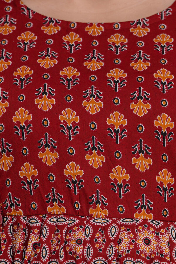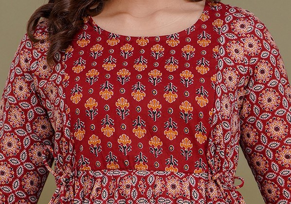 Step into timeless elegance with our Deep Maroon Anarkali Dress, a masterpiece of traditional prints and modern comfort. This calf-length ensemble features a beautiful all-over mandala and geometric pattern in earthy orange and cream tones, making it an ideal choice for office wear, casual gatherings, or cultural events.