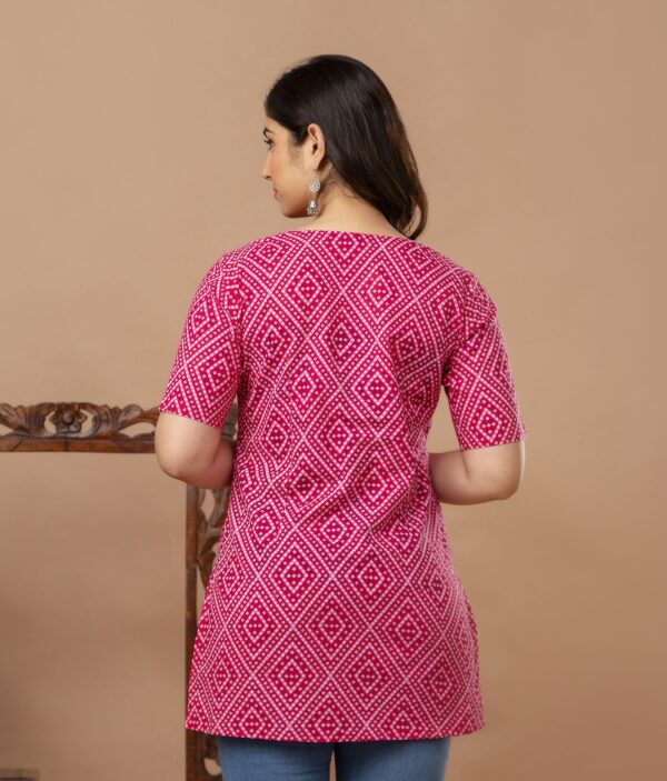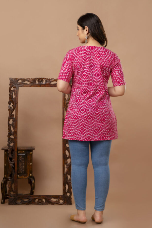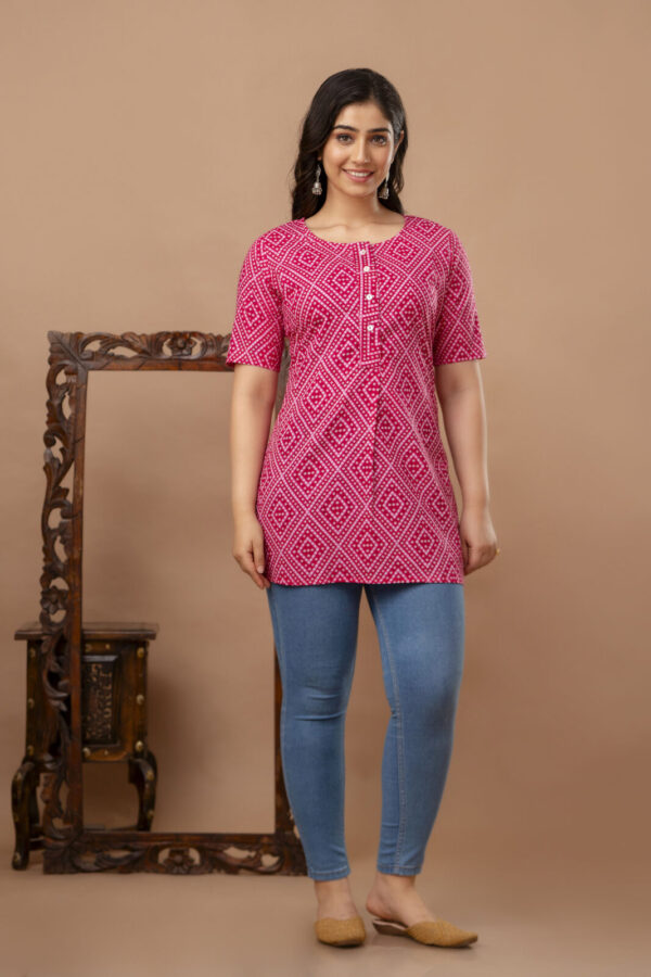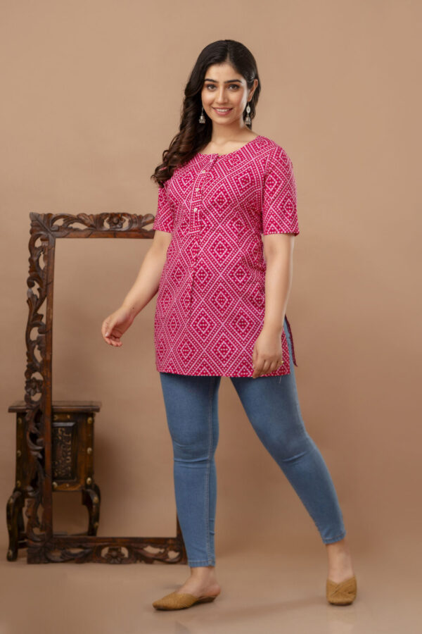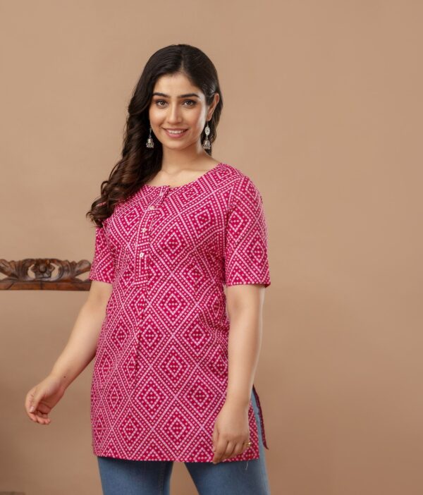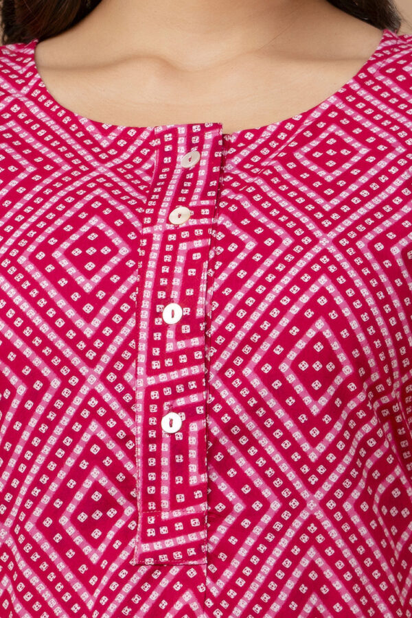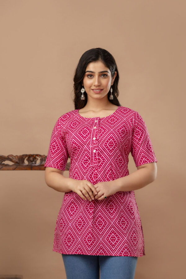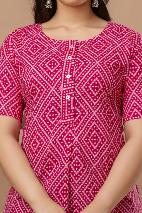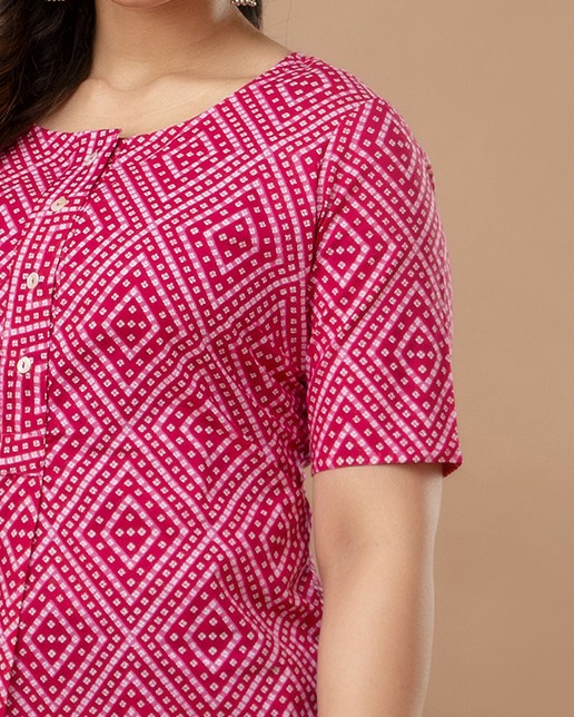 Brighten up your casual wardrobe with this vibrant fuchsia pink straight kurti. Featuring a timeless geometric Bandhani-inspired print, this piece offers a clean, modern silhouette that celebrates traditional Indian textile patterns. Crafted from high-quality breathable cotton, it is the perfect go-to for daily wear, office outings, or casual meetups.