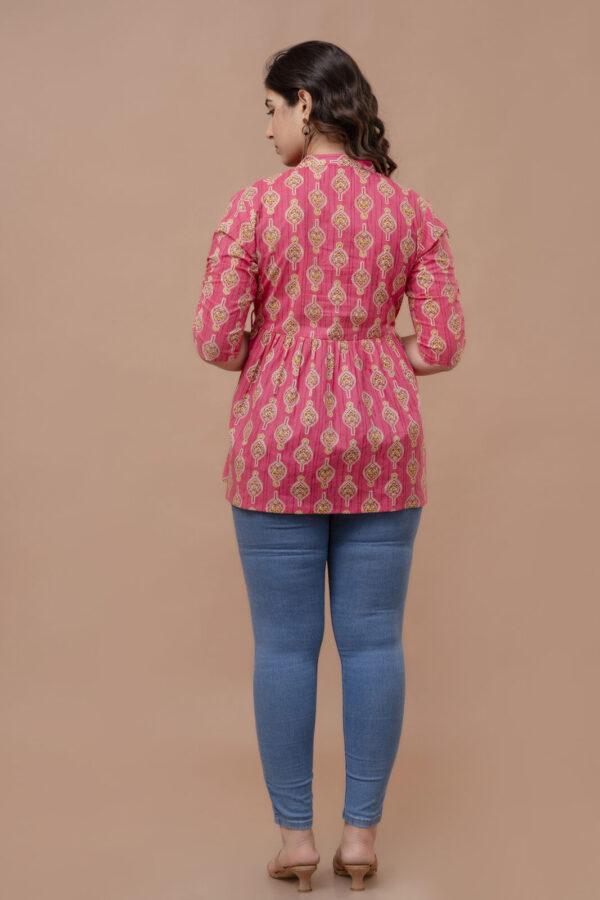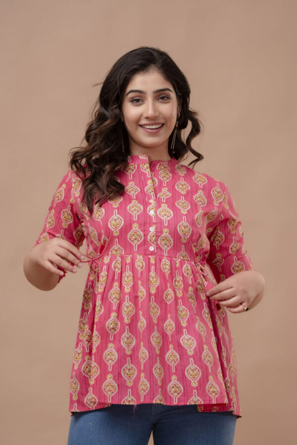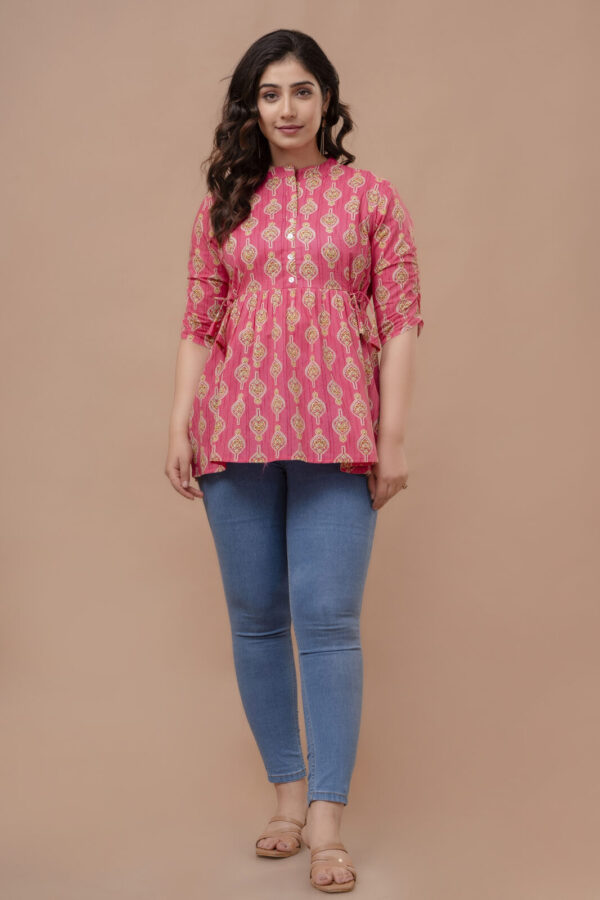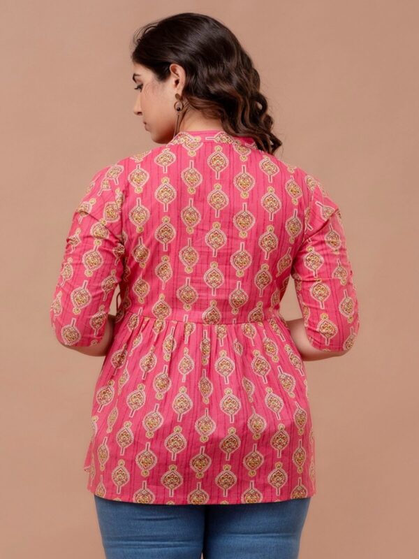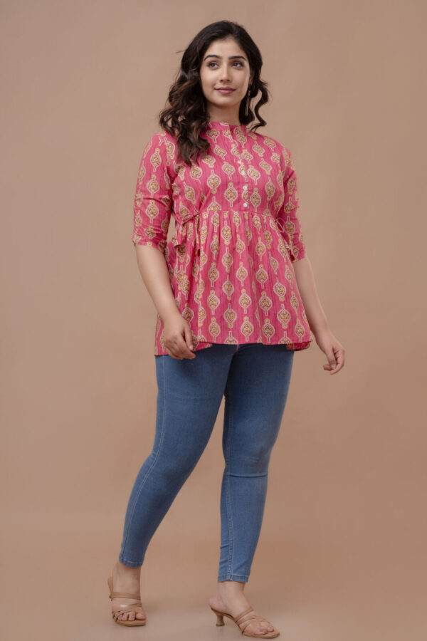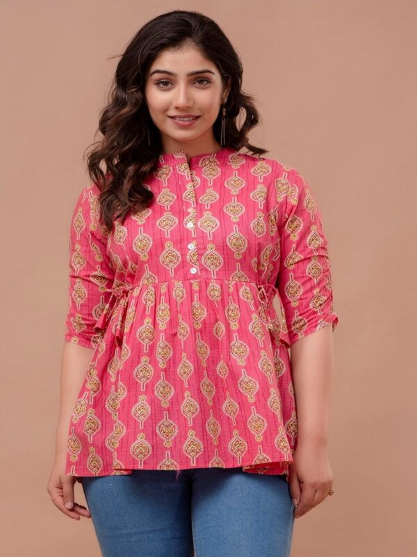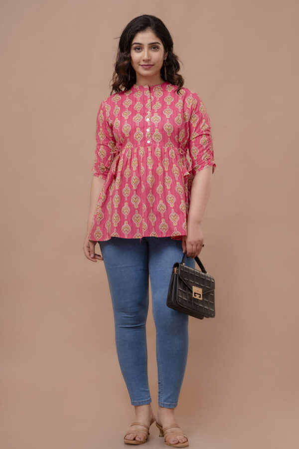 Add a pop of vibrant color to your casual ensemble with this fuchsia pink peplum tunic. Featuring a traditional ethnic boota print, this top combines a modern flared silhouette with classic Indian motifs, making it a perfect choice for college, office, or weekend outings.