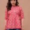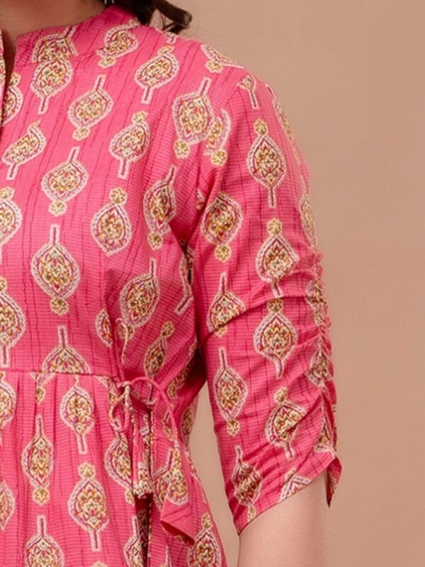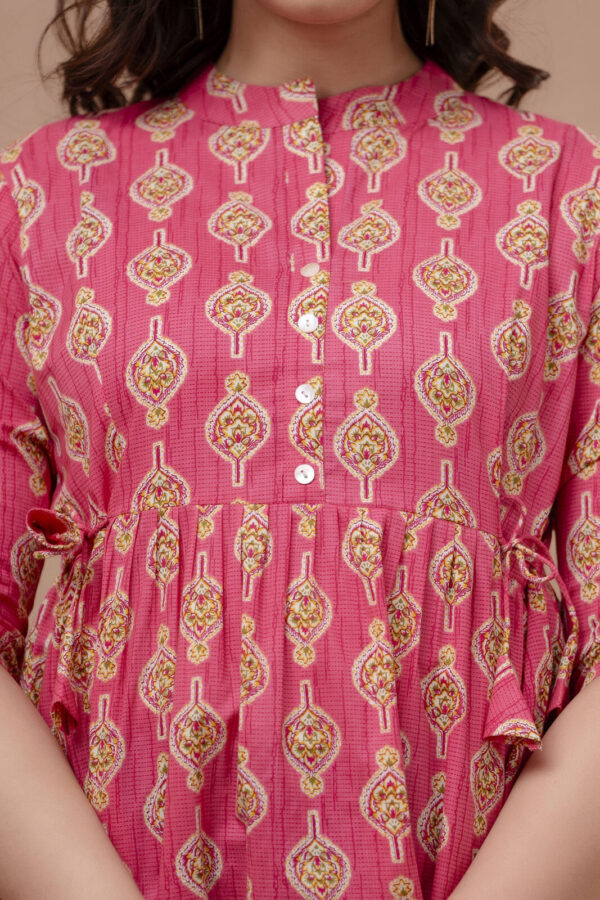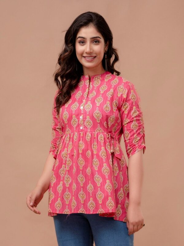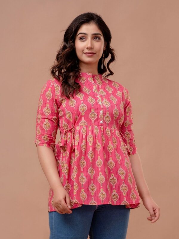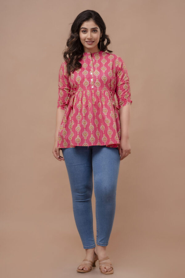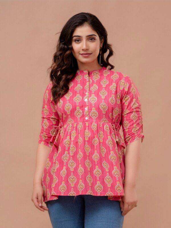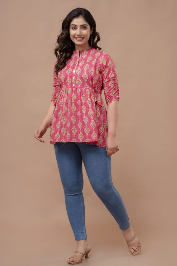 Add a pop of vibrant color to your casual ensemble with this fuchsia pink peplum tunic. Featuring a traditional ethnic boota print, this top combines a modern flared silhouette with classic Indian motifs, making it a perfect choice for college, office, or weekend outings.