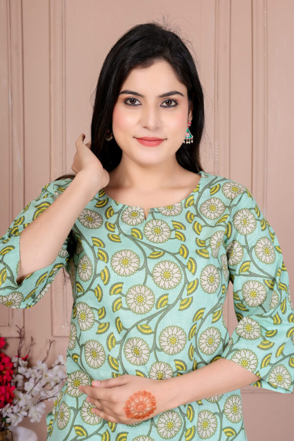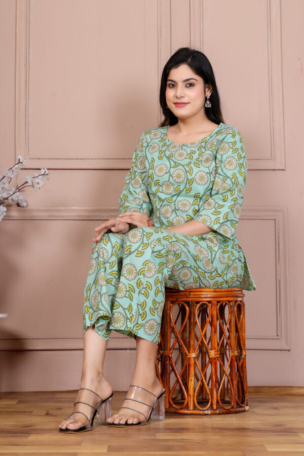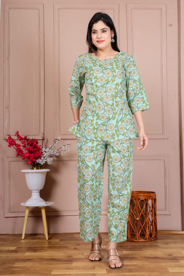 Exude a refreshing and graceful vibe with this pista green co-ord set, a perfect addition to your summer lounge and casual wear collection. Crafted from high-quality breathable cotton, this matching duo features an intricate floral jaal (vine) print that combines traditional aesthetics with modern comfort.