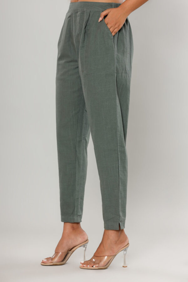Add a touch of understated luxury to your daily rotation with these sage green trousers. Featuring a unique, muted green hue, these pants are crafted from a high-quality cotton-linen blend that offers a distinct slub texture and exceptional breathability for all-day wear.