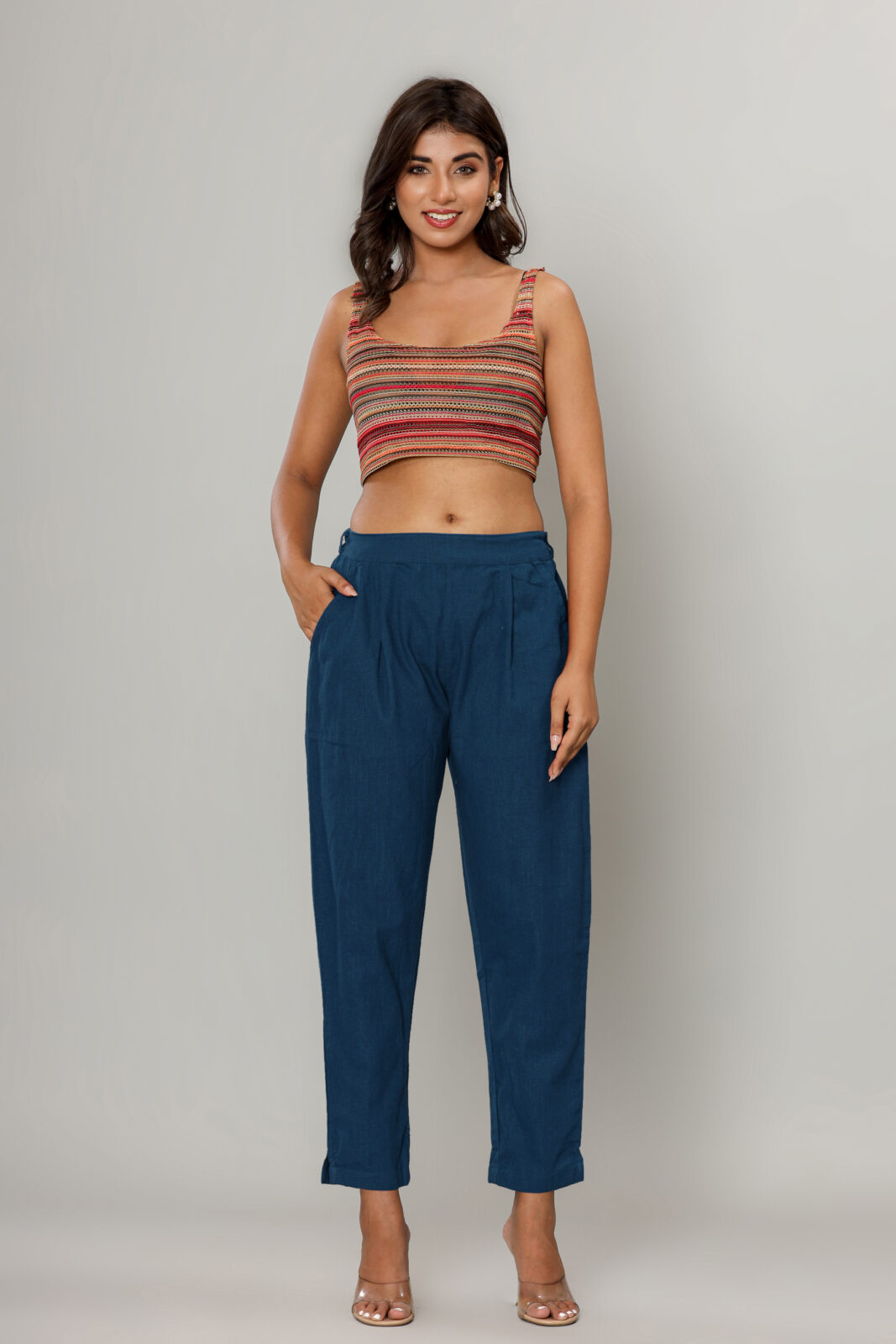 Styling Tip: These navy classics serve as the perfect neutral base. Pair them with a pastel pink blouse for a soft look, or a bold mustard yellow top for a striking contrast.